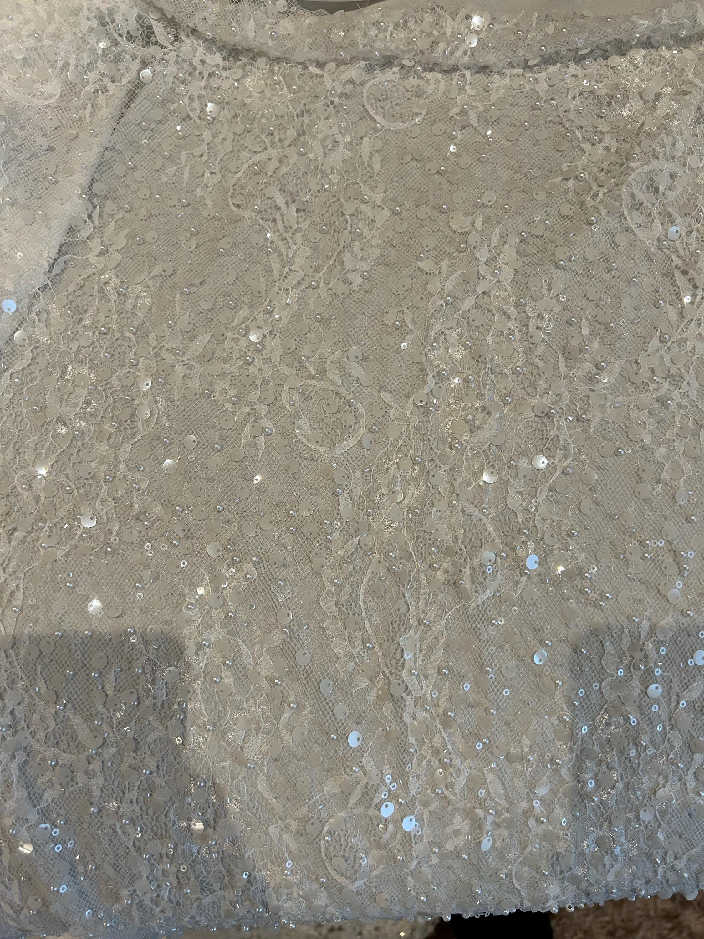 off white Chantilly lace fabric with sequins and beads, beaded chantilly lace fabric for bridal dress