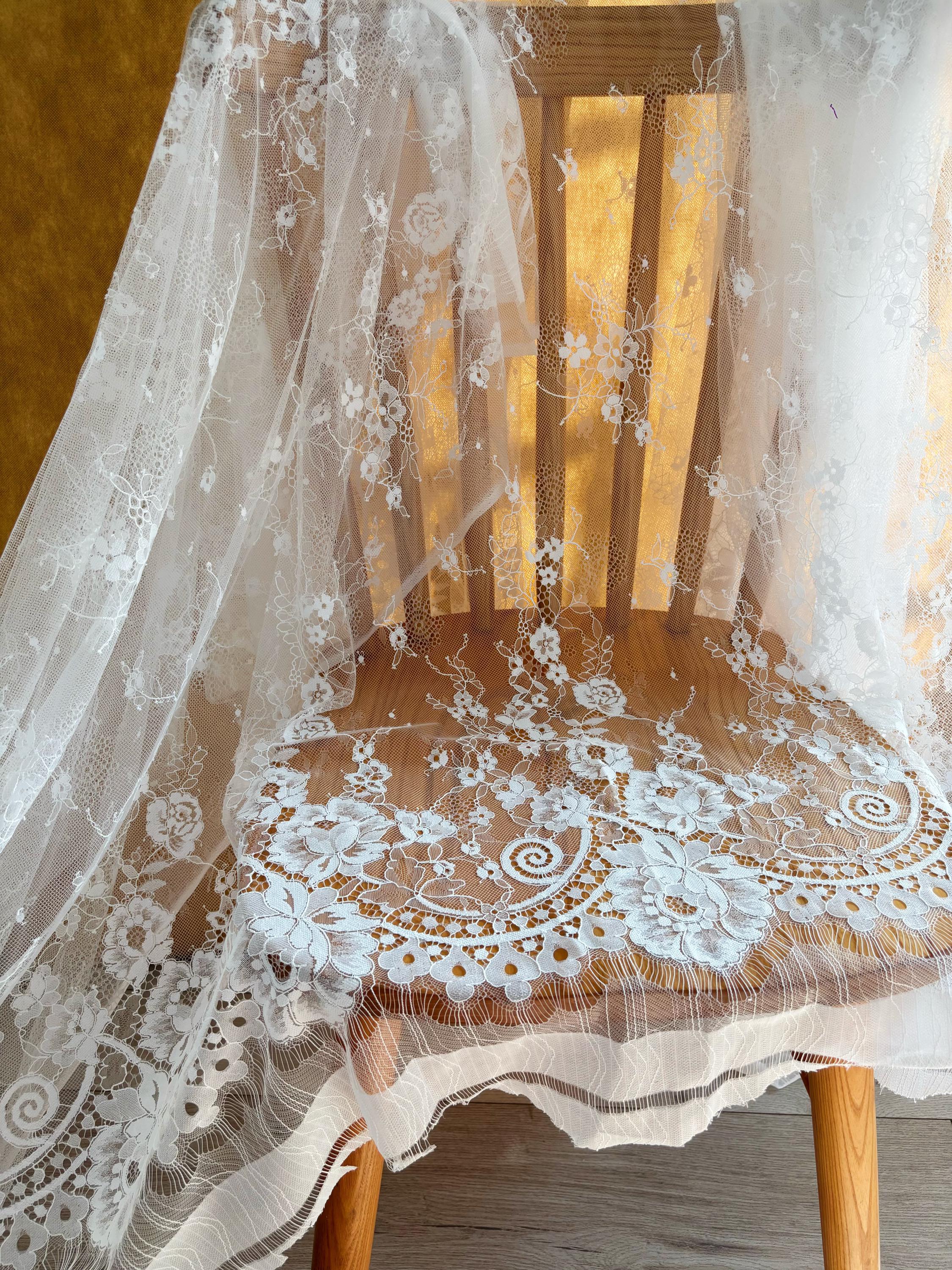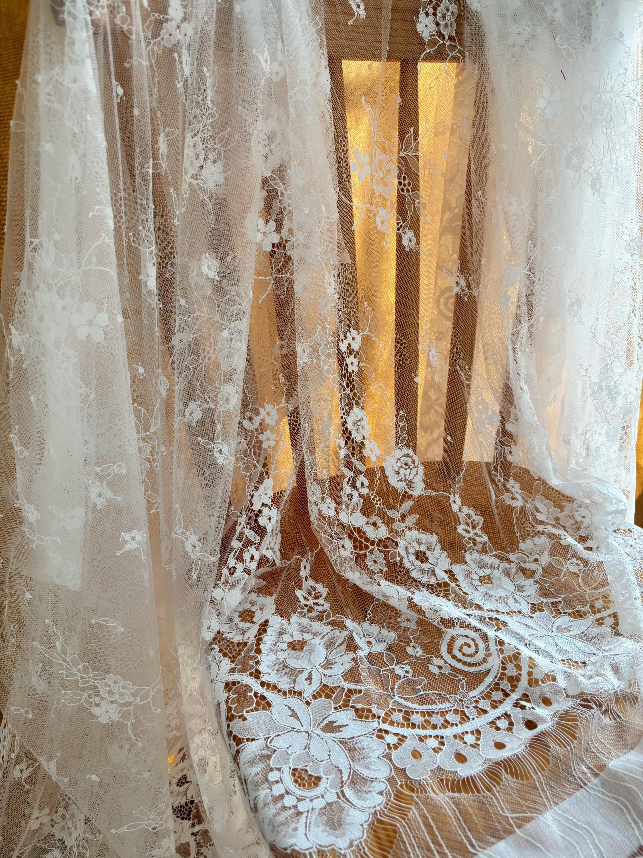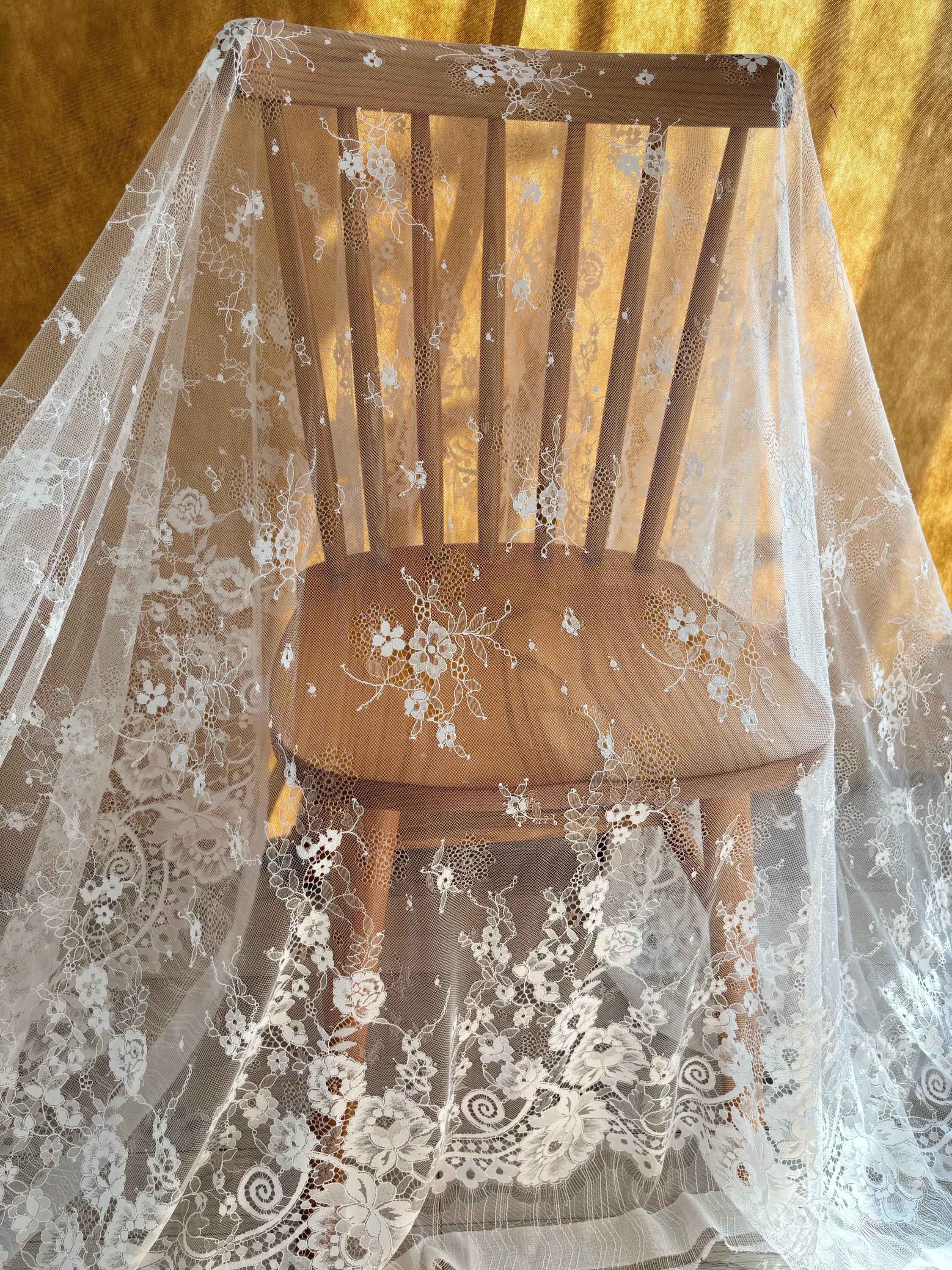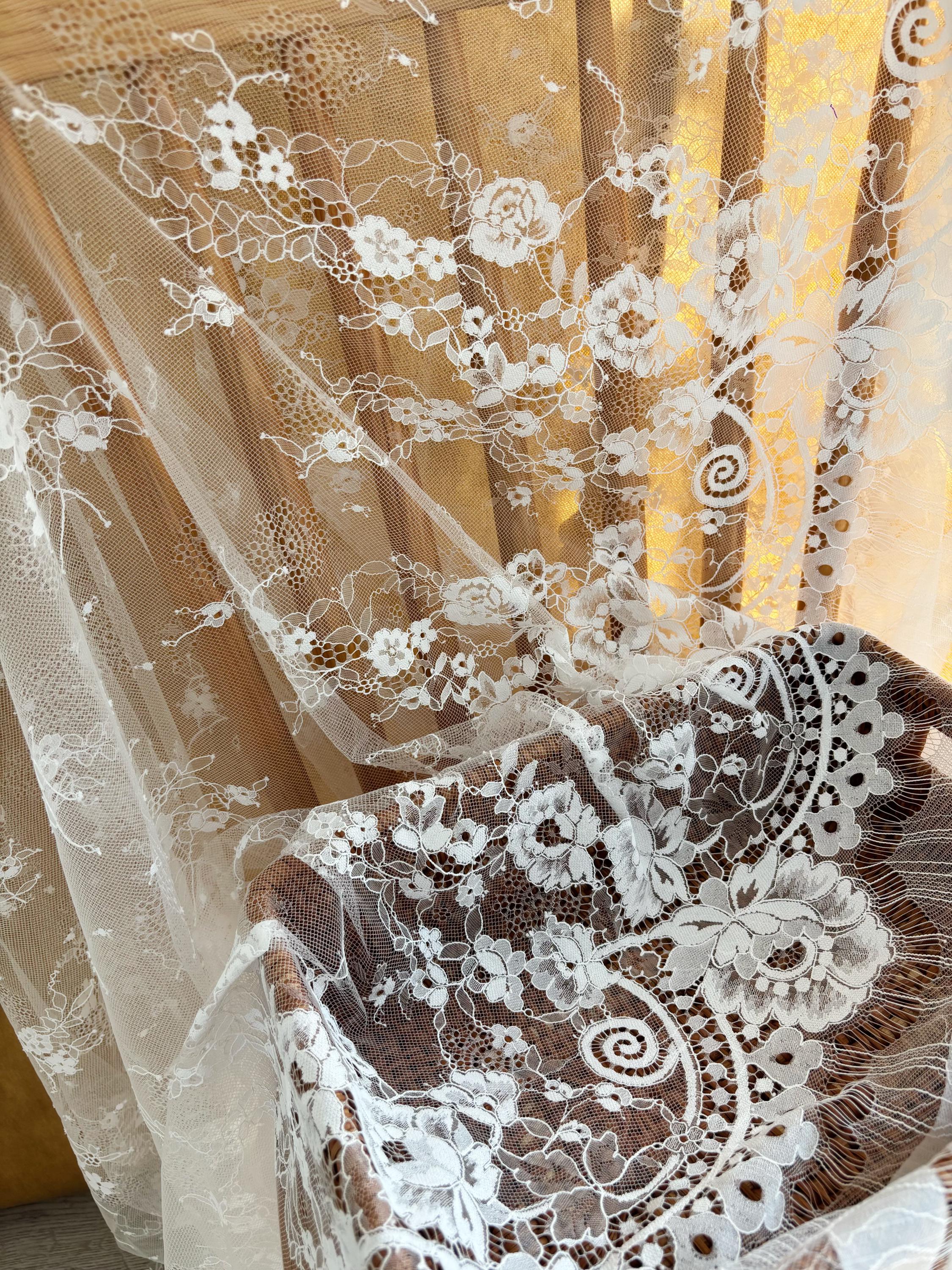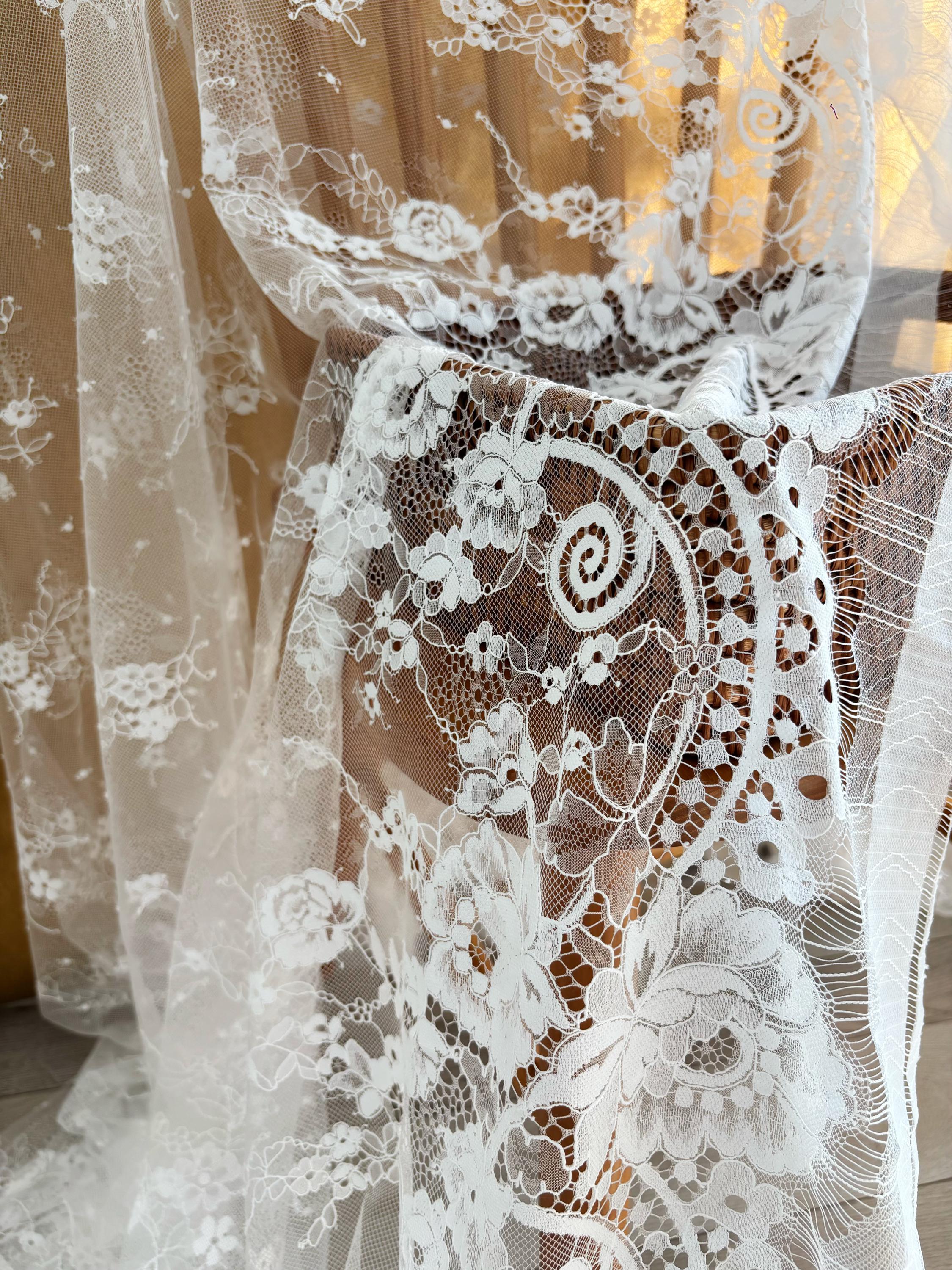 off white Chantilly lace fabric with big flowers for bridal veil, bridal gown, gift for brides
