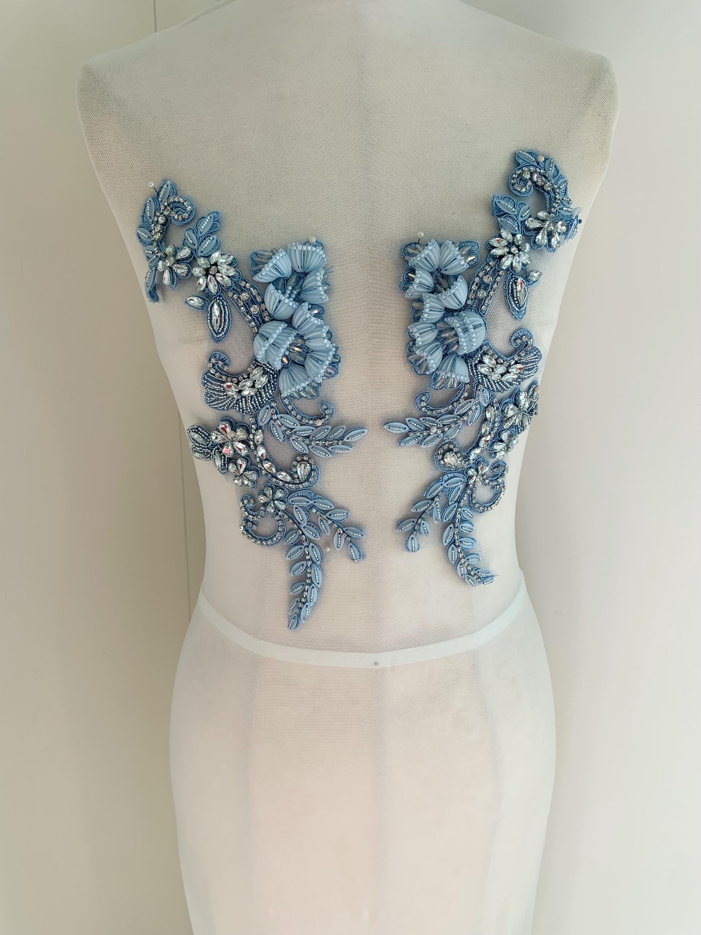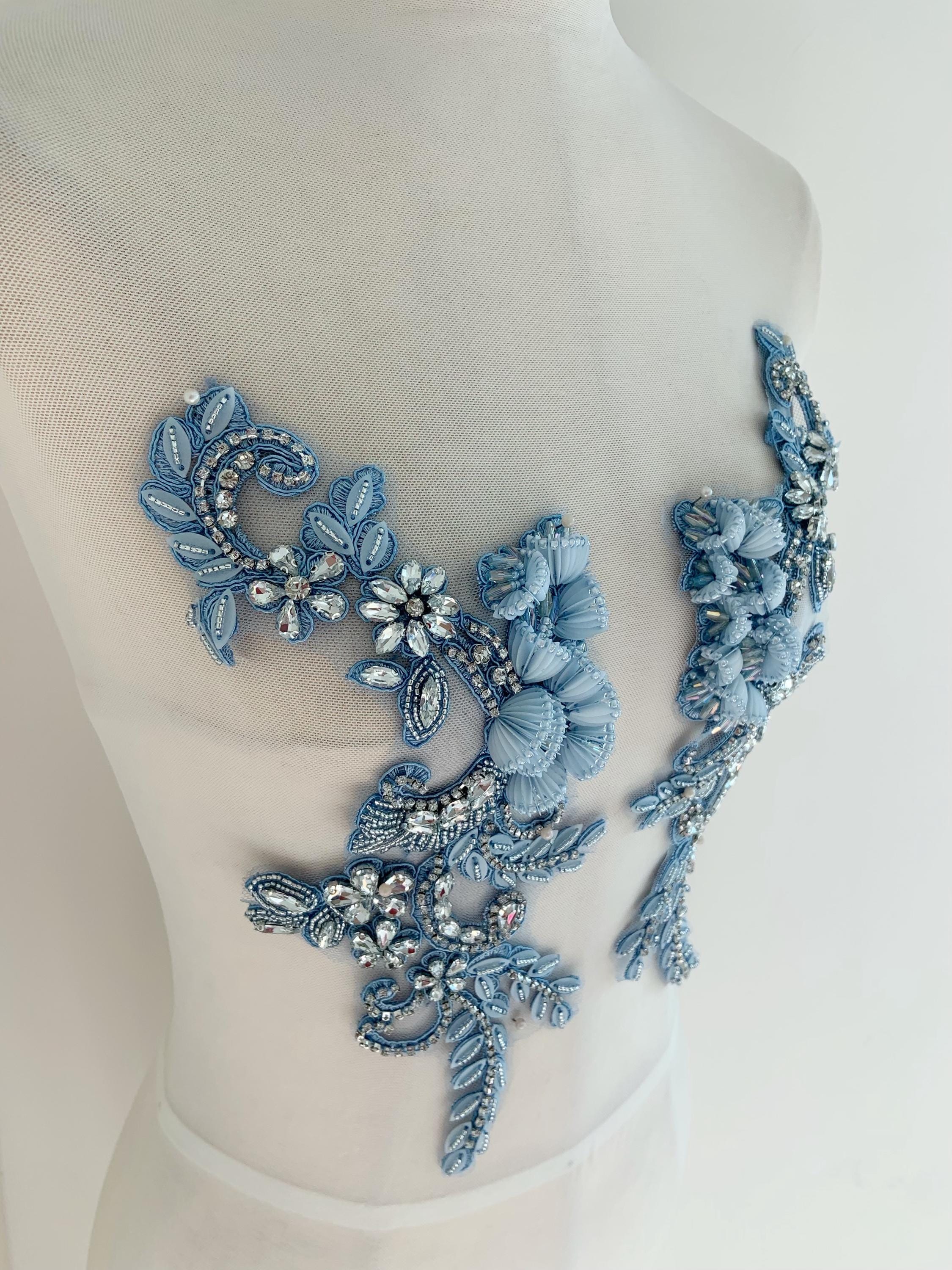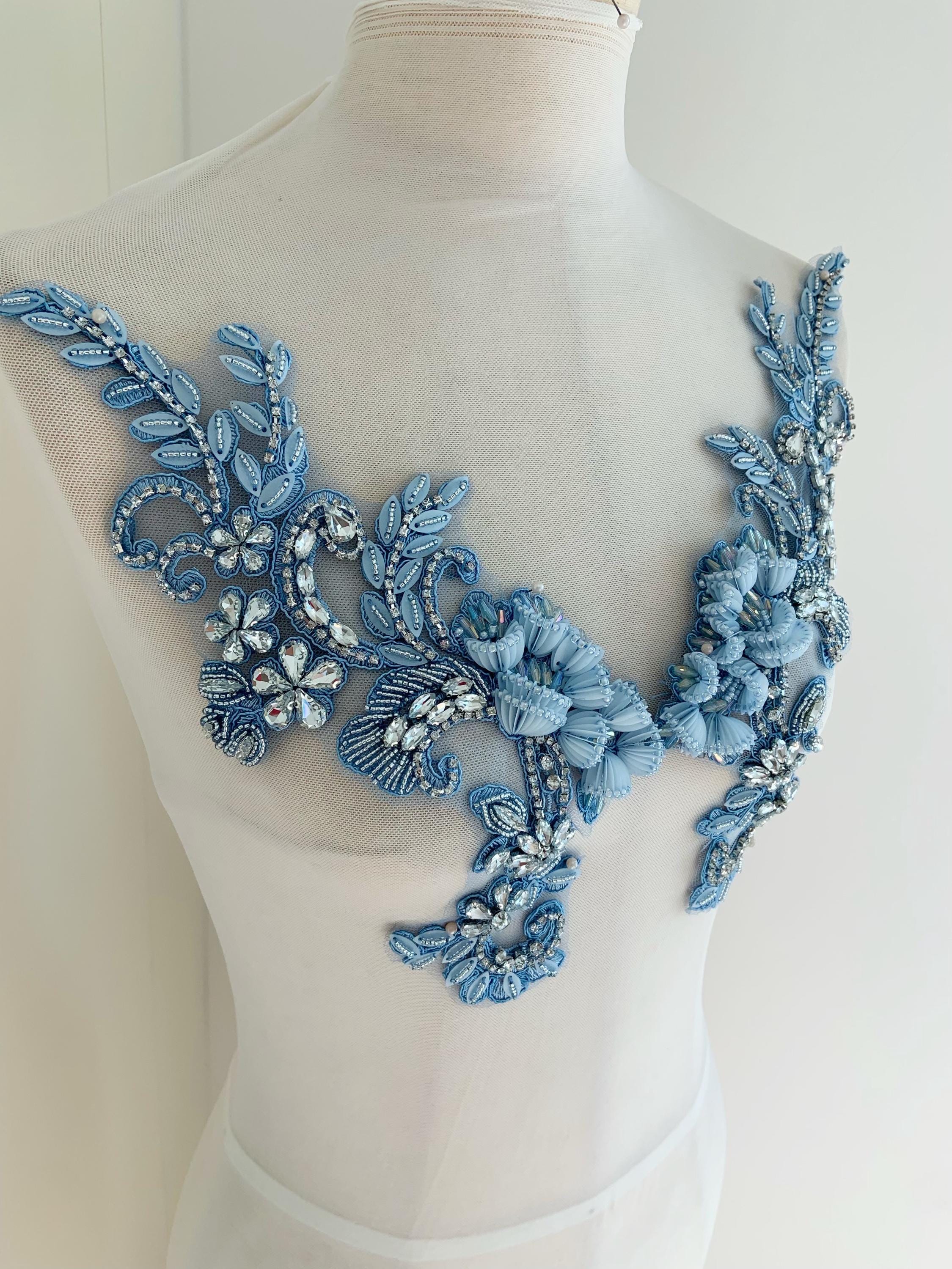 baby blue rhinestone applique flower applique, 3d hand bead flower patch for dress, apparel supplies