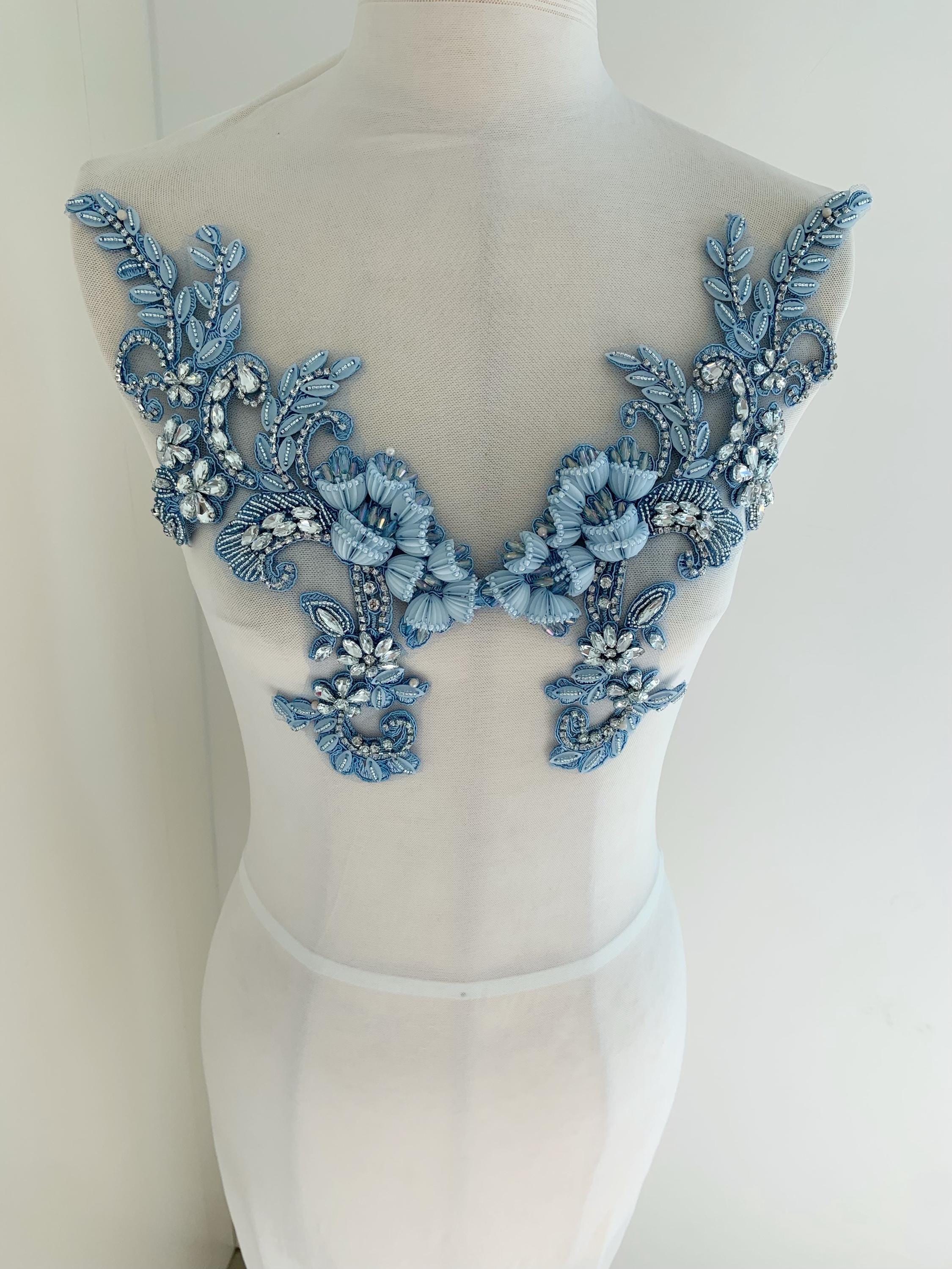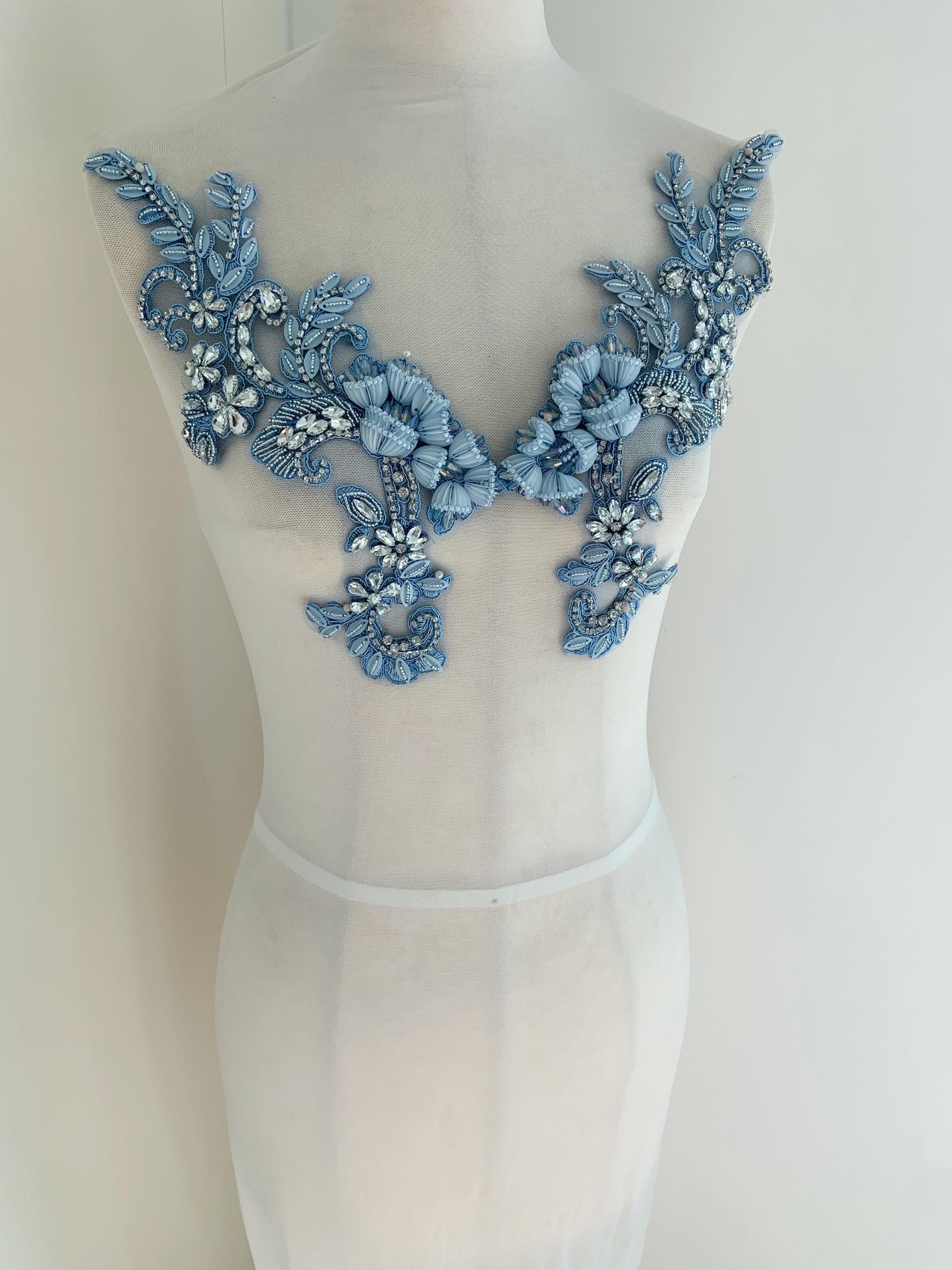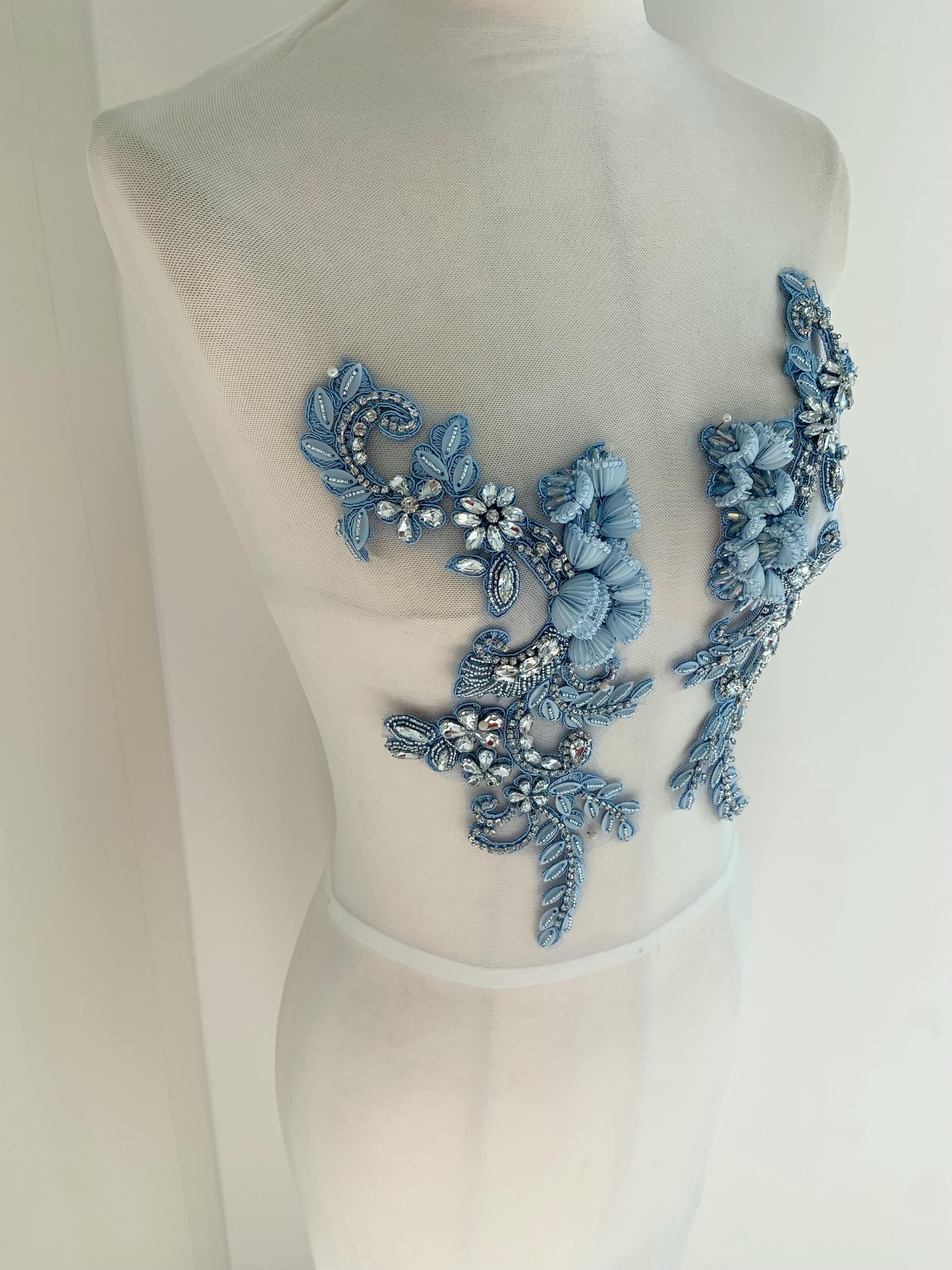 baby blue rhinestone applique flower applique, 3d hand bead flower patch for dress, apparel supplies