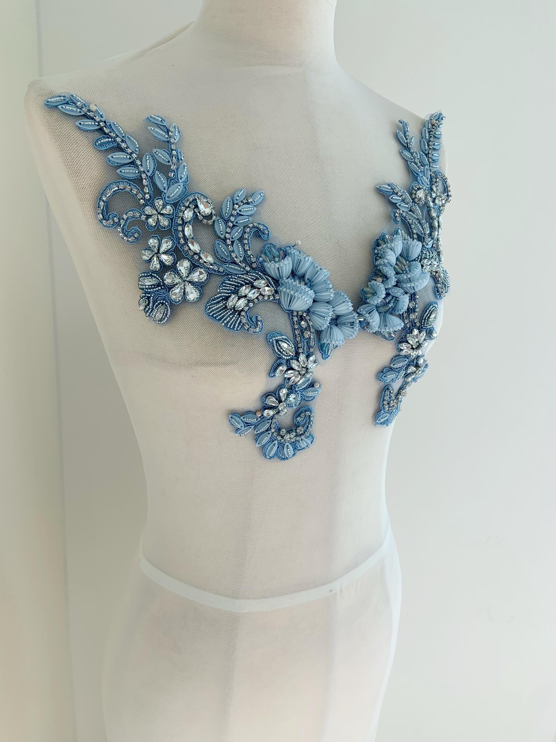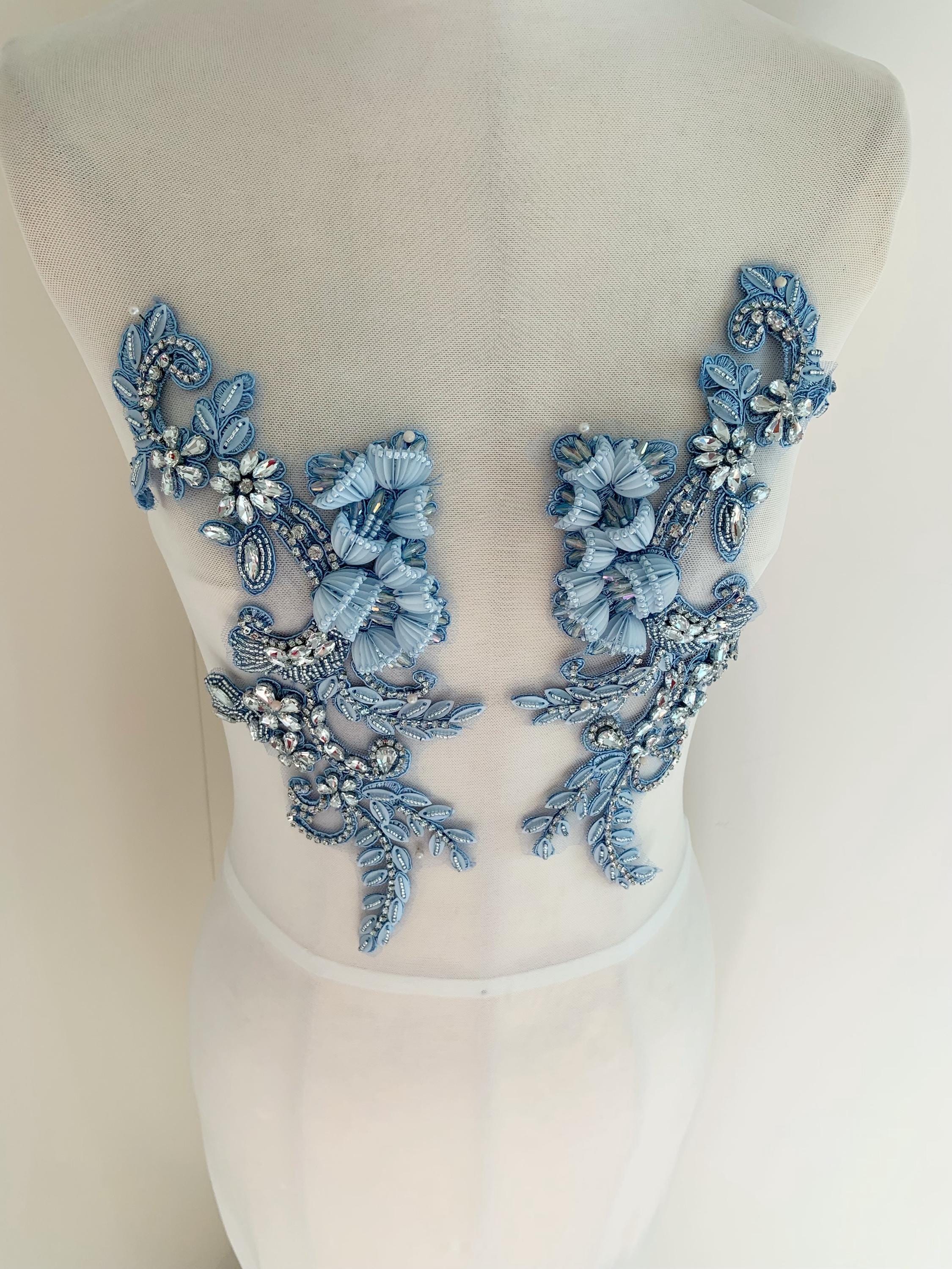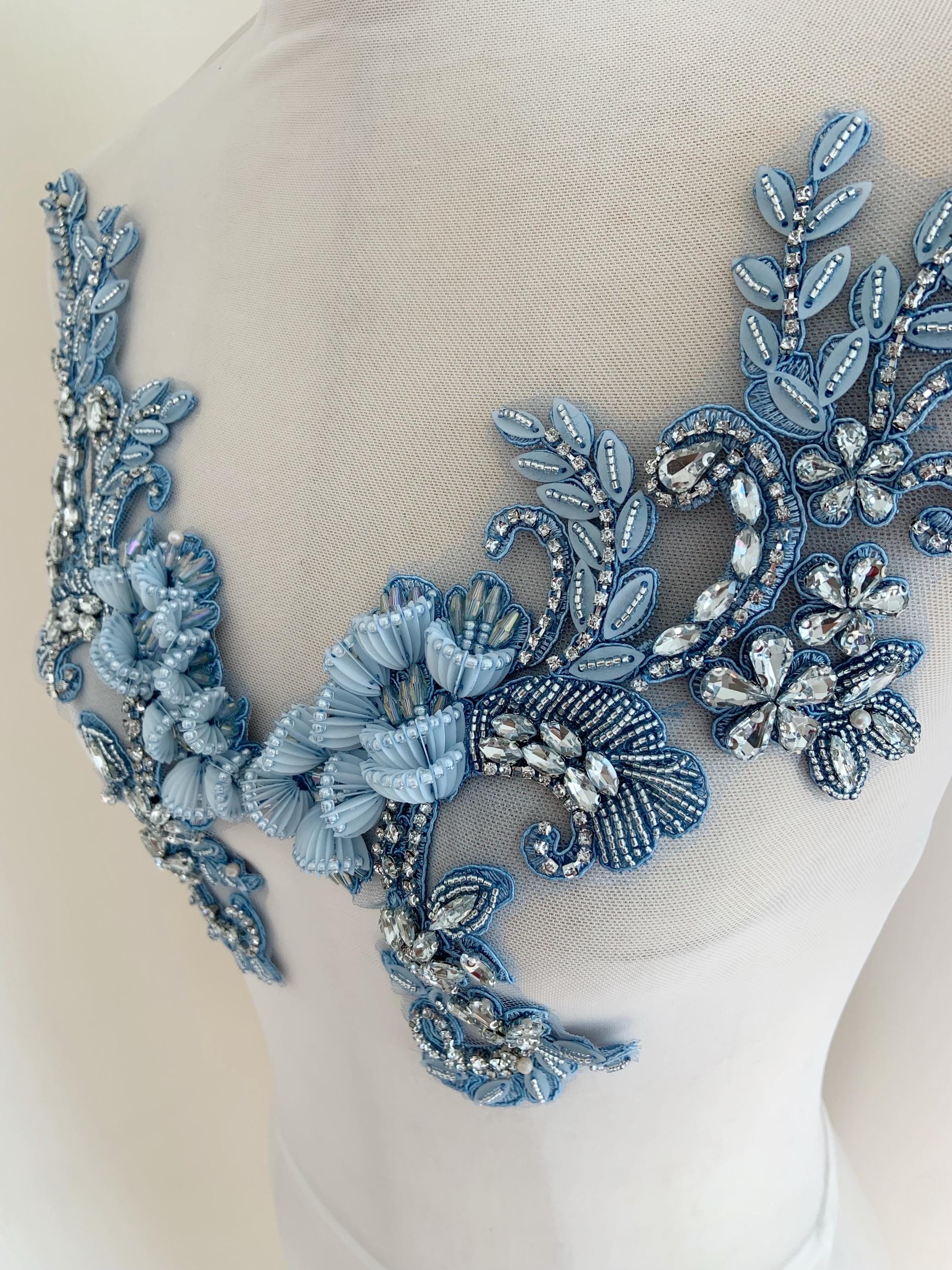This stunning rhinestone applique is hand crafted, design with elegant florals. There is a layer of iron on glue on the back, sew it to your dress or iron it on will both work. Suitable for bridal dress, evening dress and haute couture for special events, highly recommended for bridals and designers.