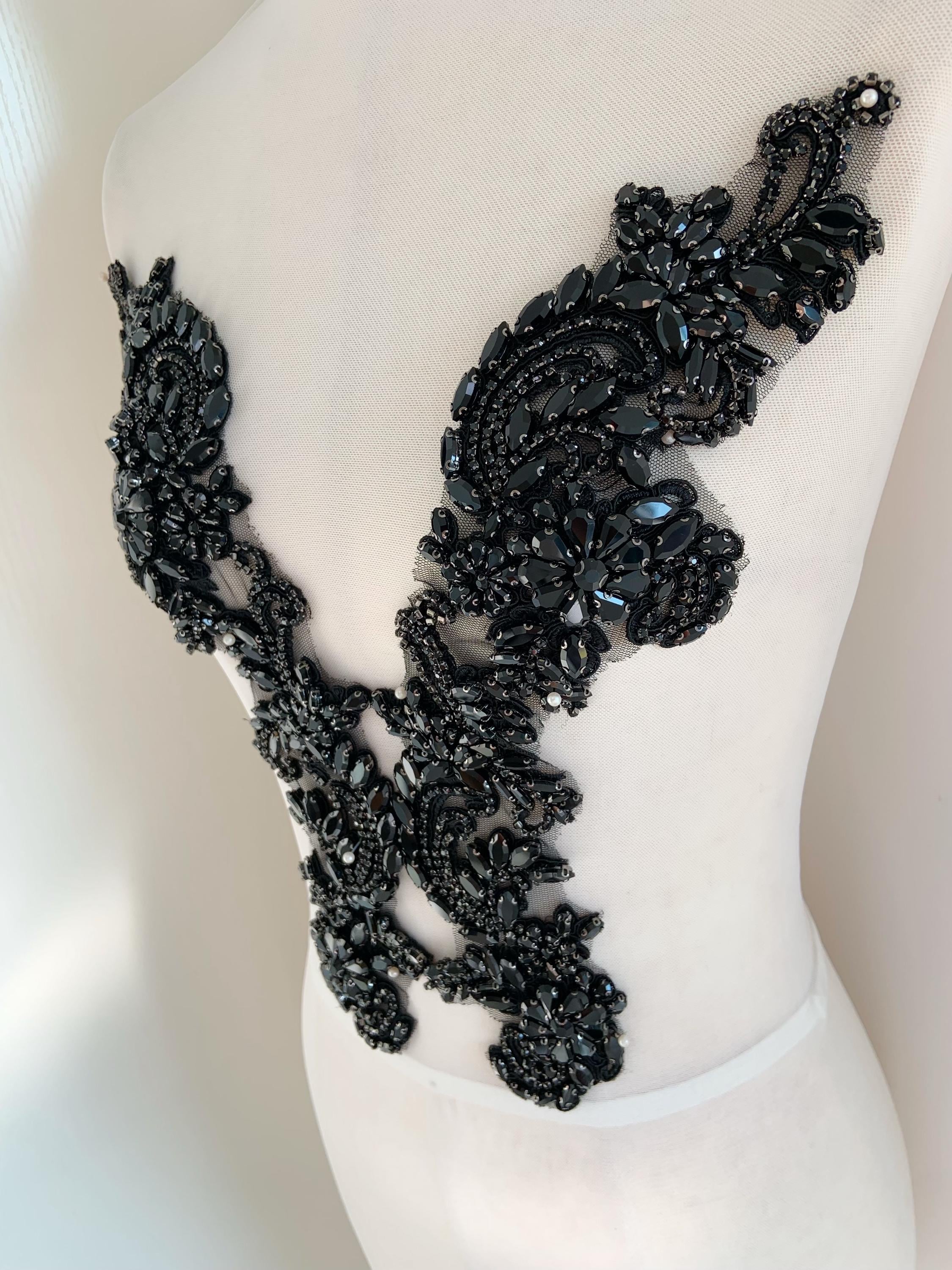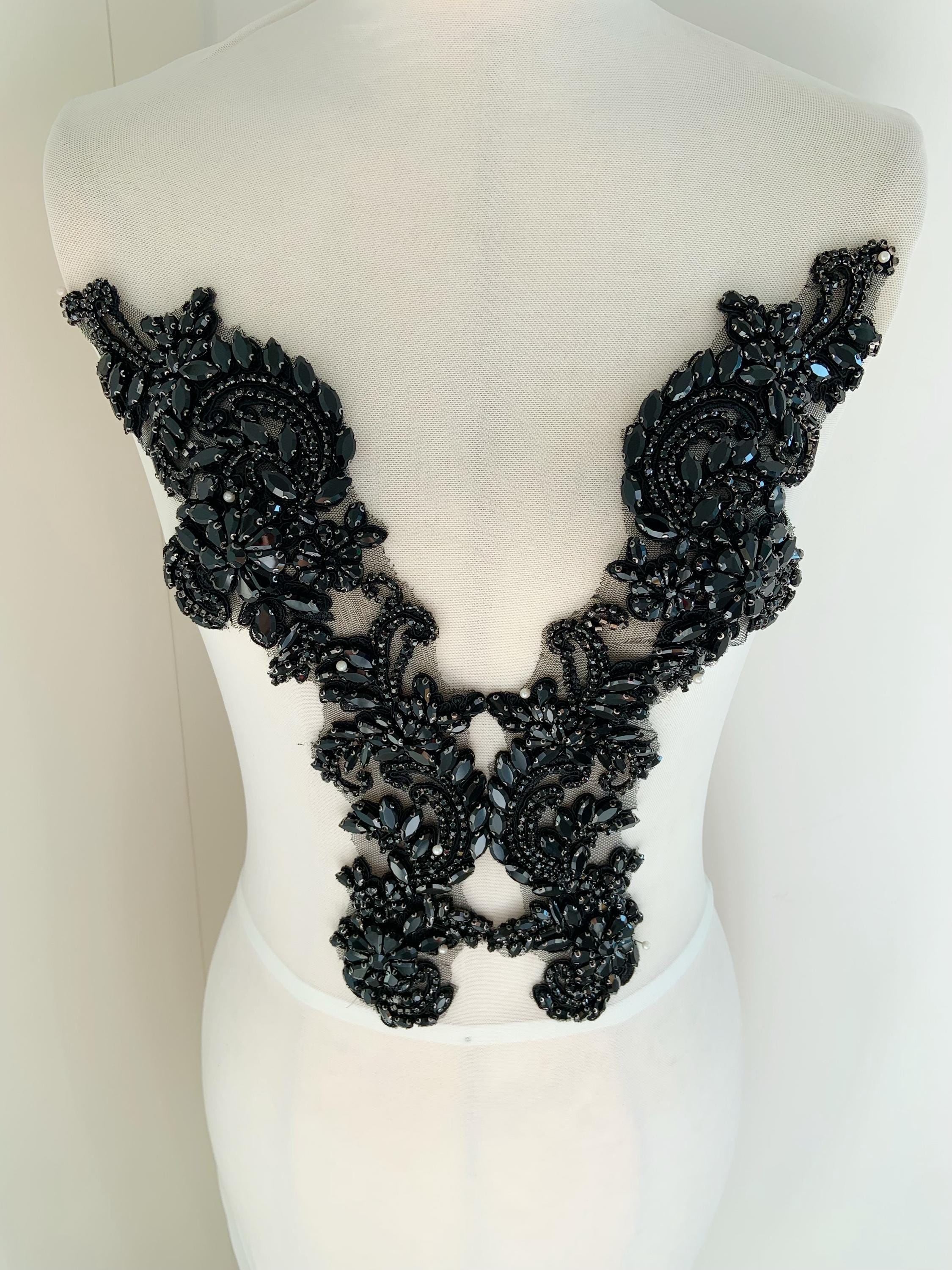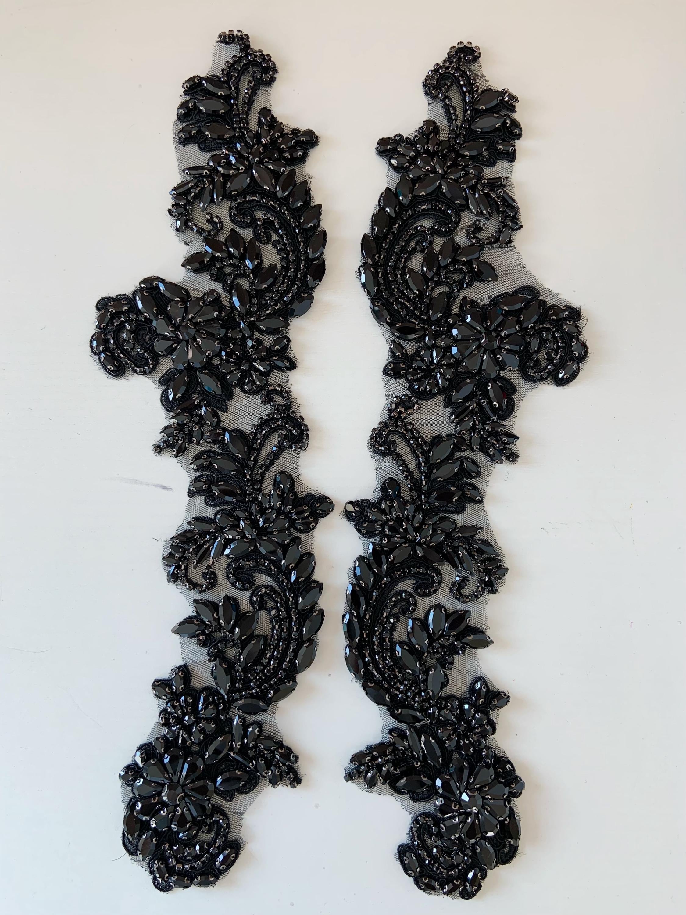 black Rhinestone appliqué by pair, black rhinestone patch with V neck line
