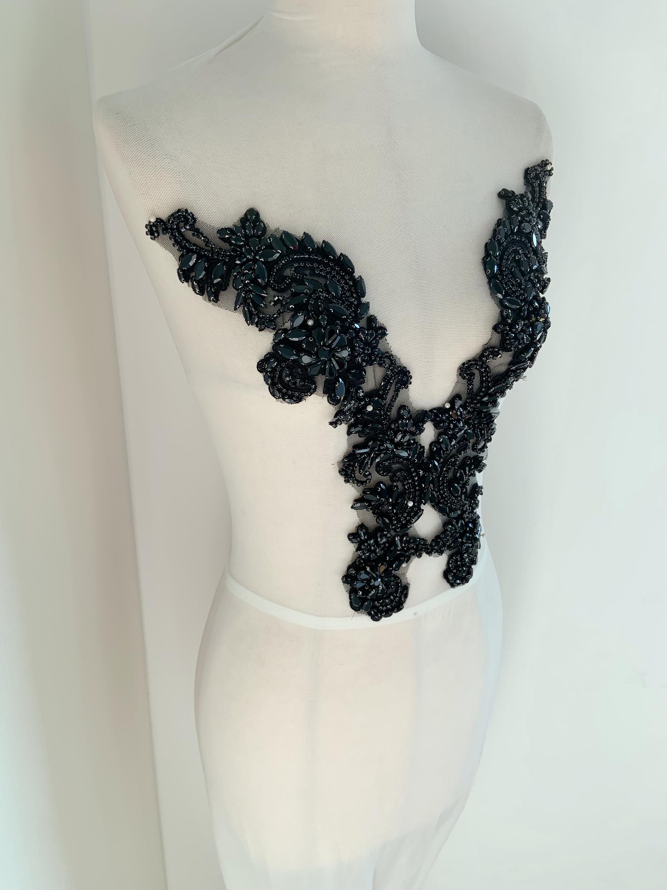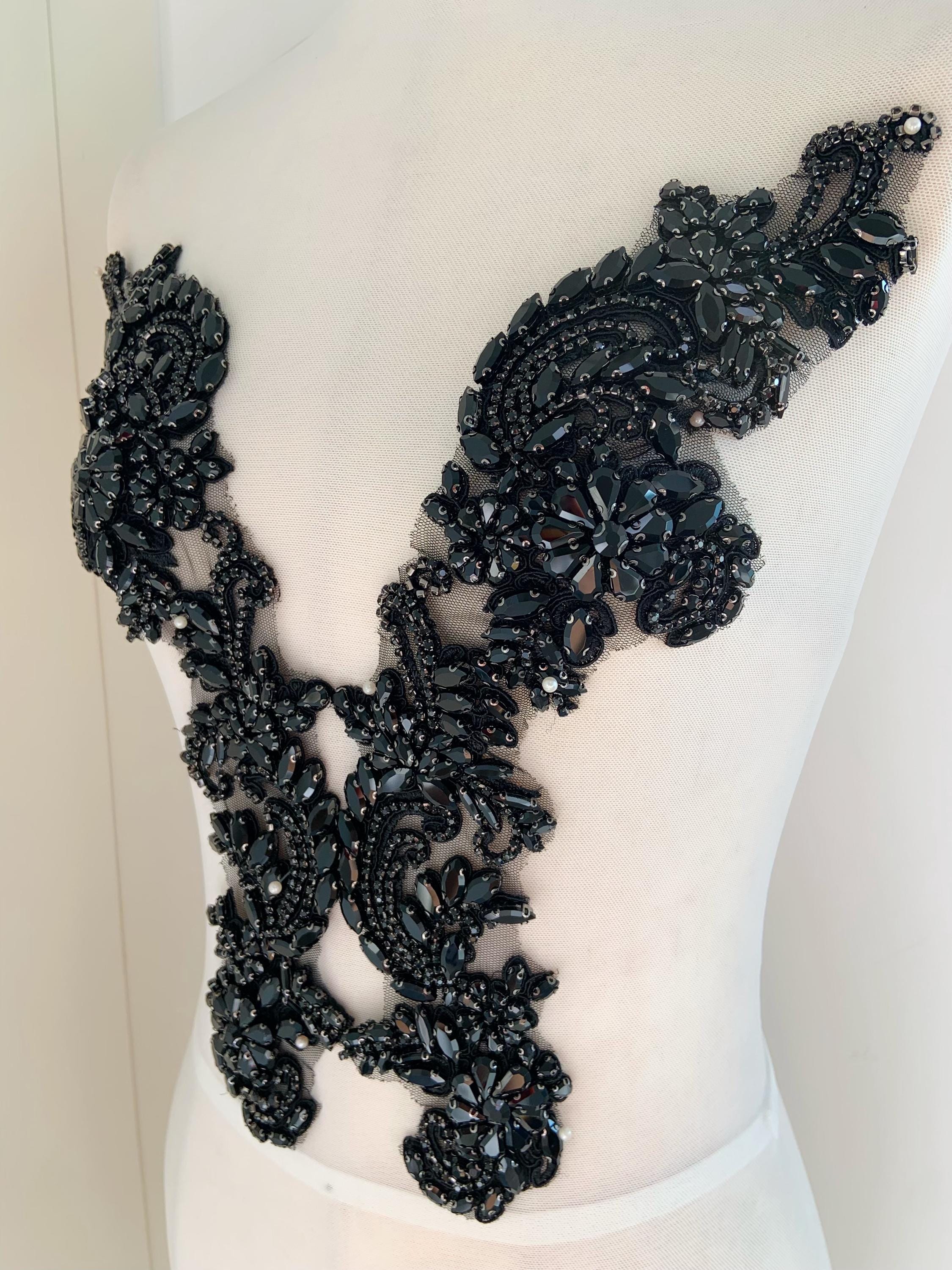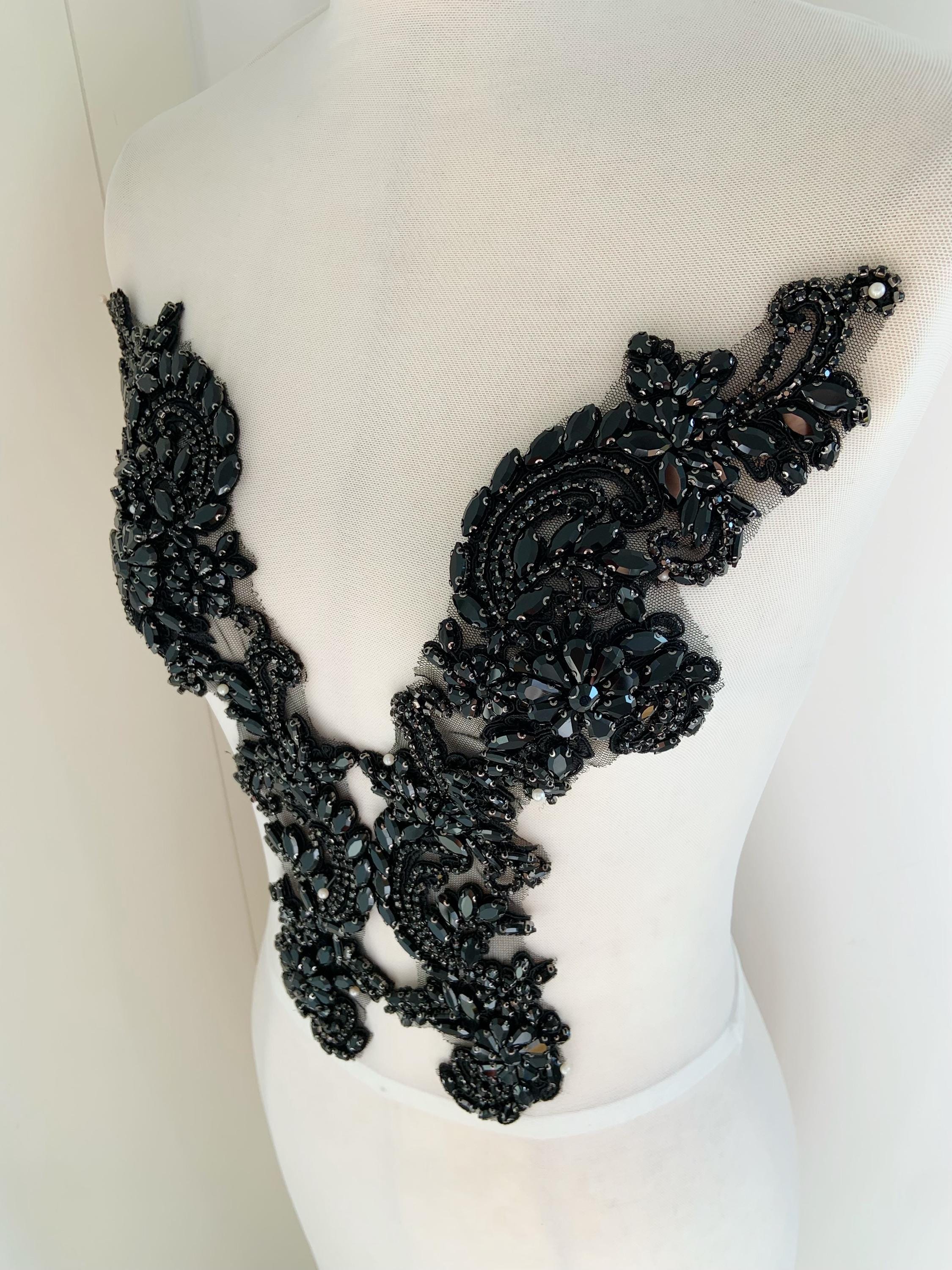 black Rhinestone appliqué by pair, black rhinestone patch with V neck line