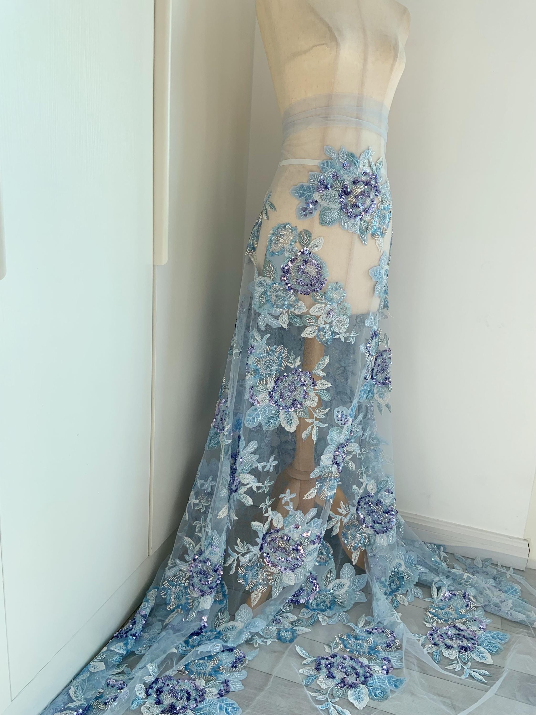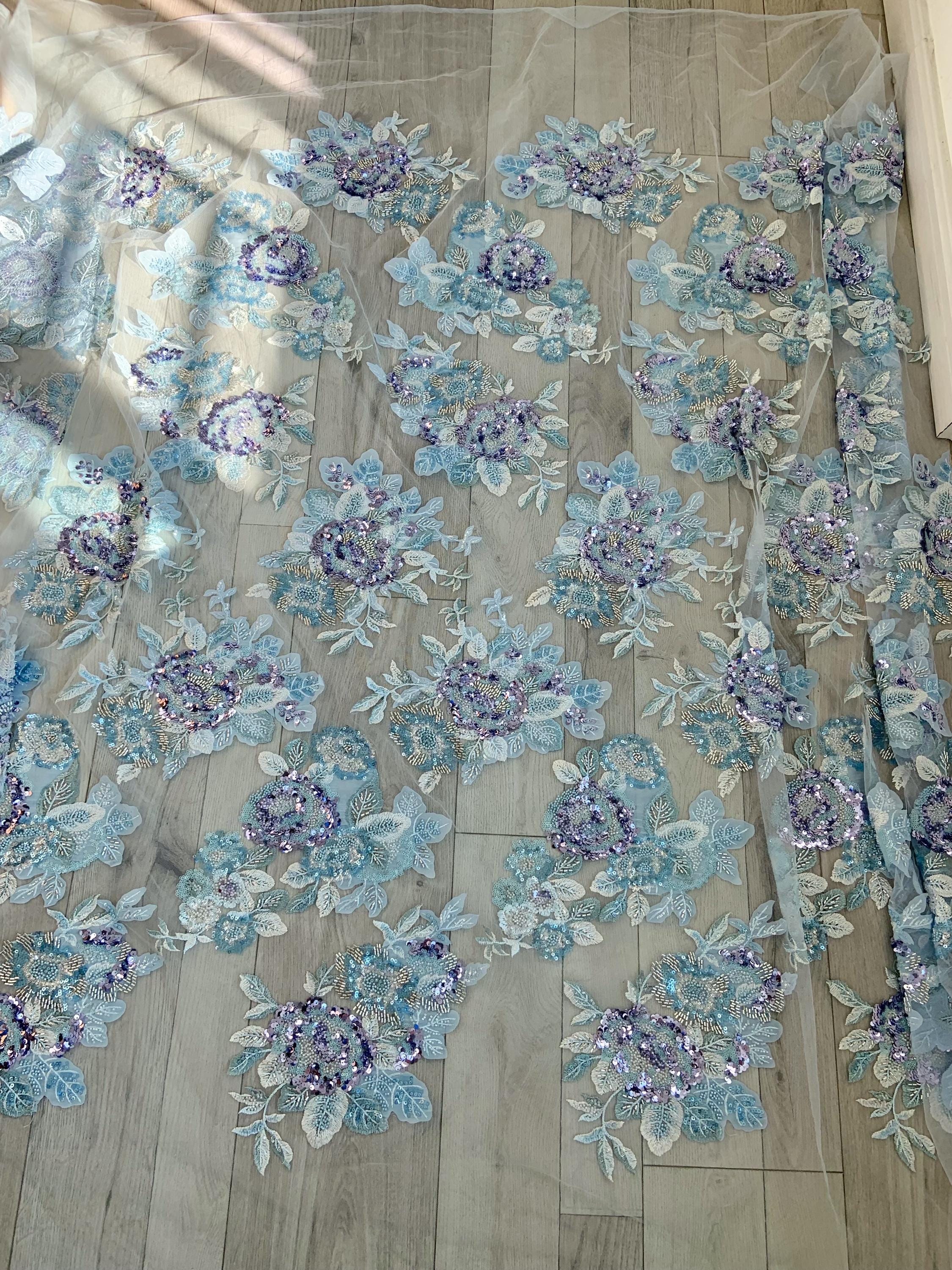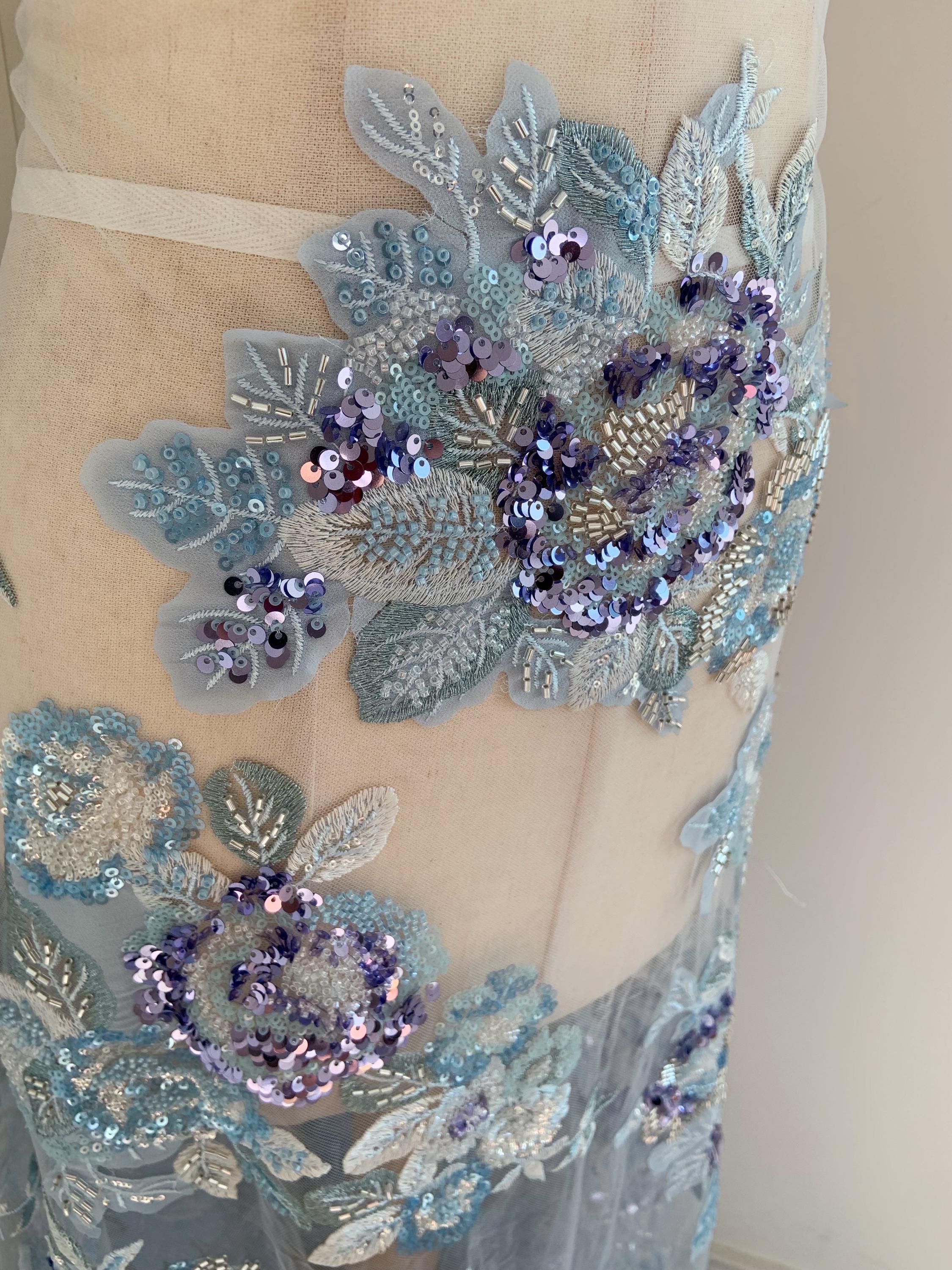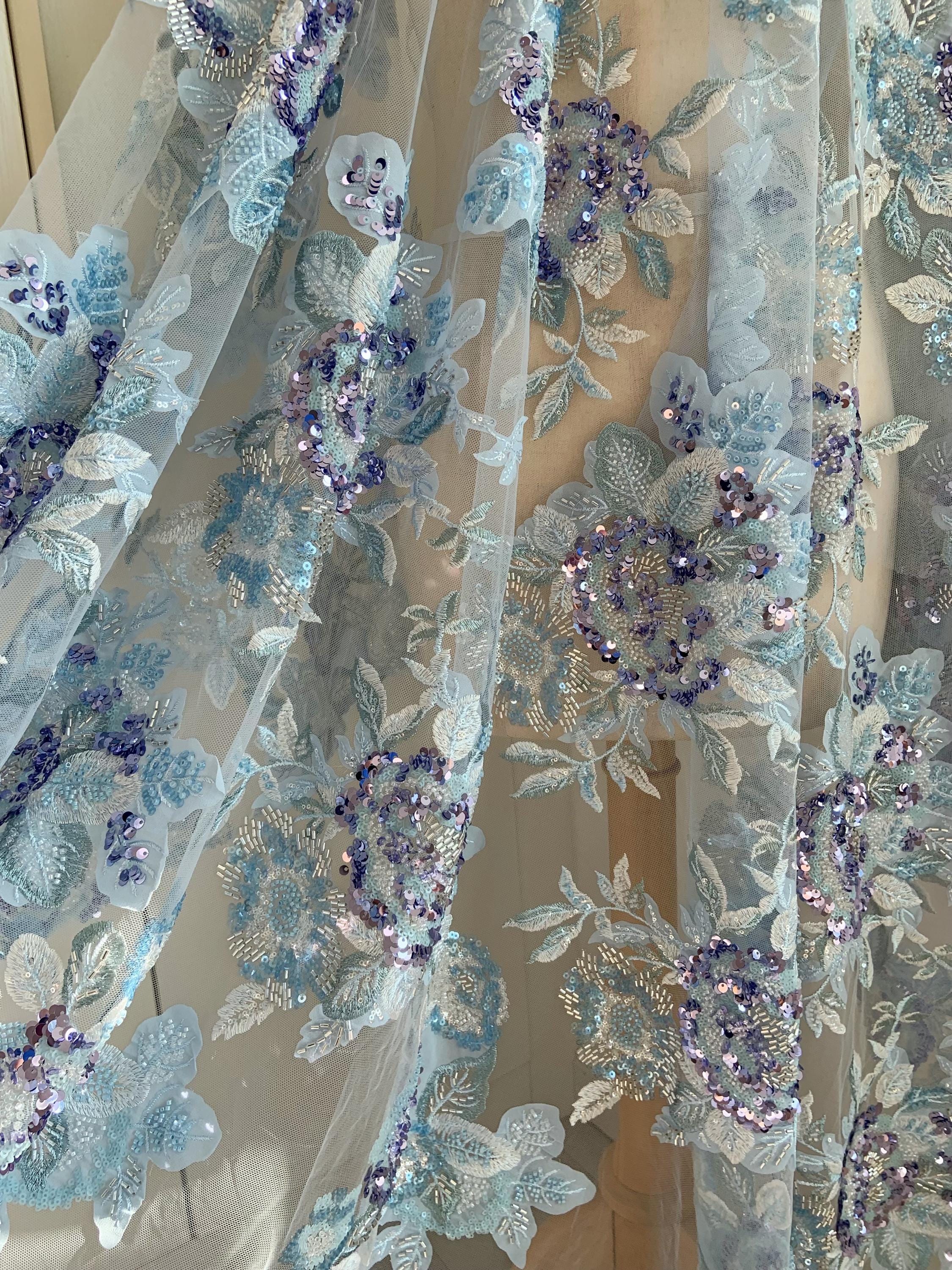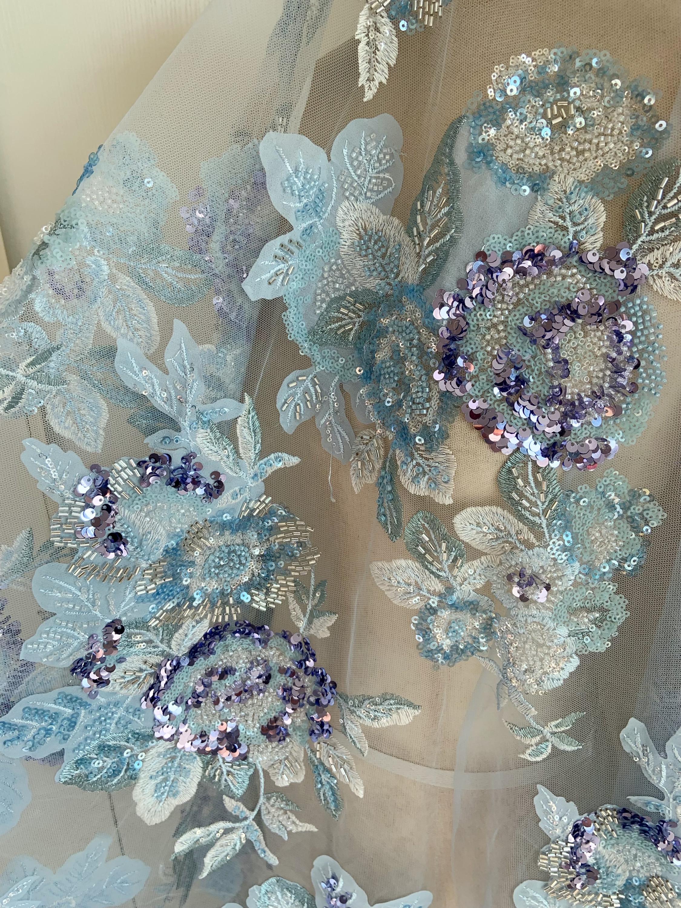 Baby blue bead embroidery fabric with flowers, heavy bead fabric with 3d florals for dress, couture