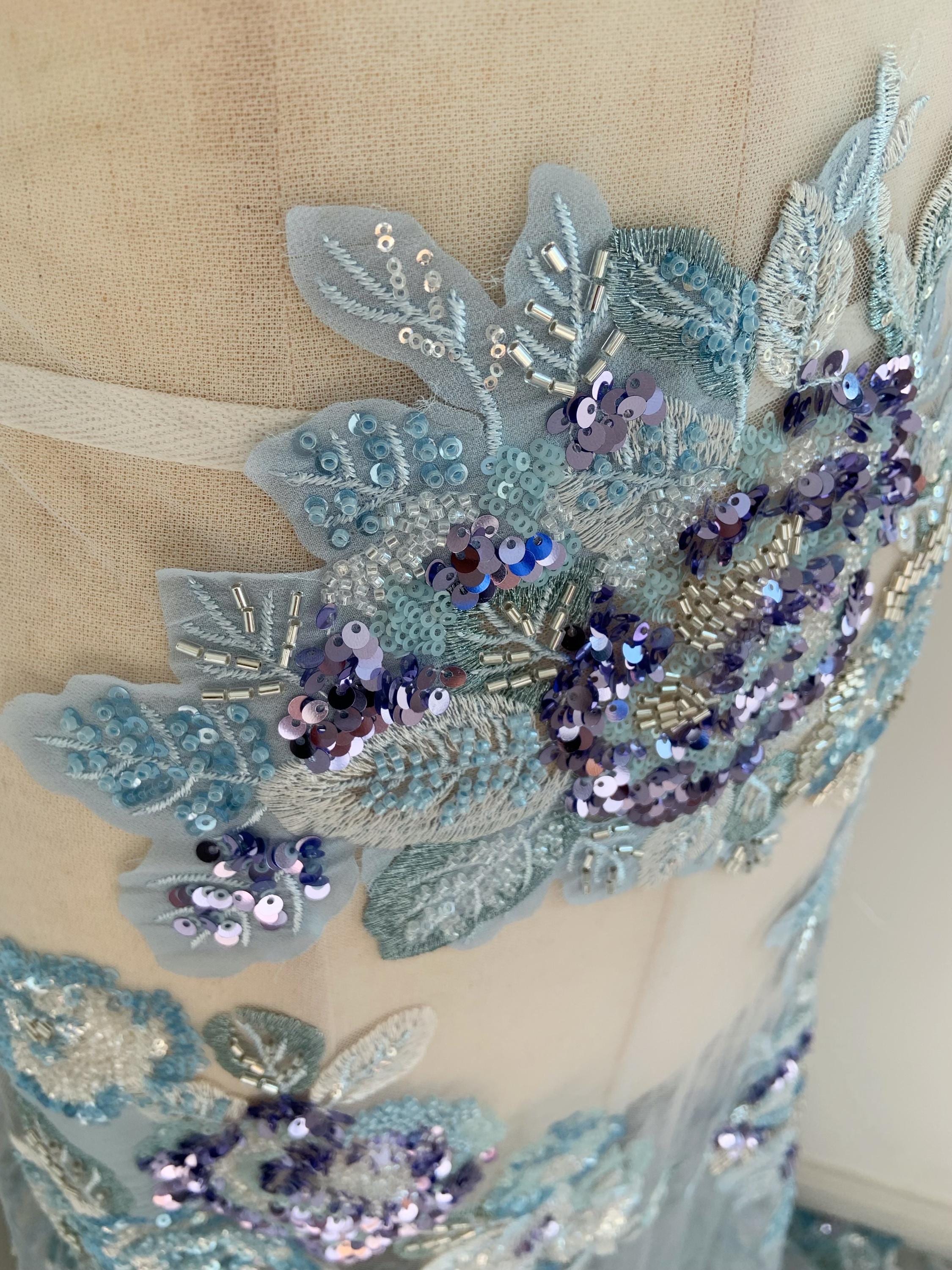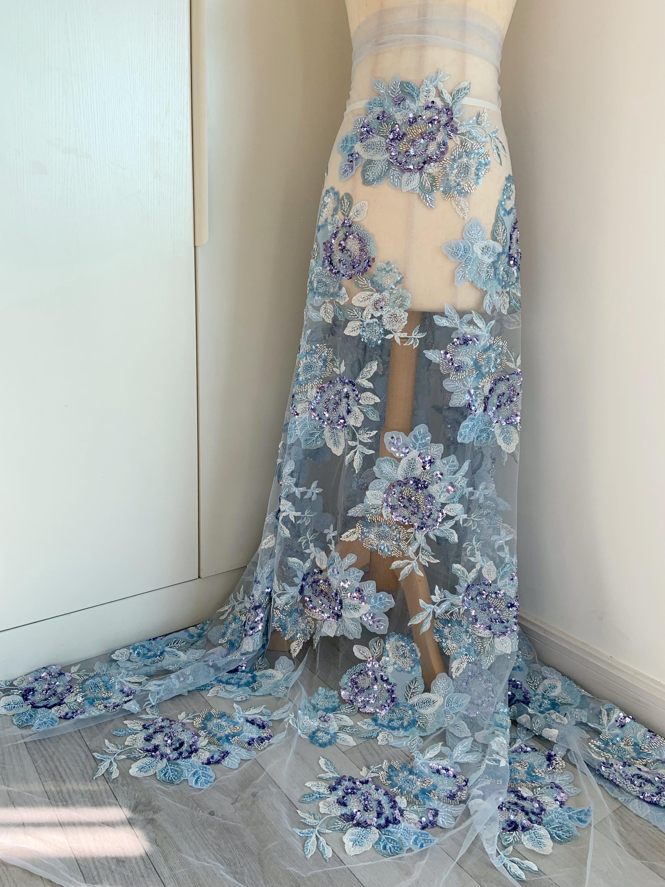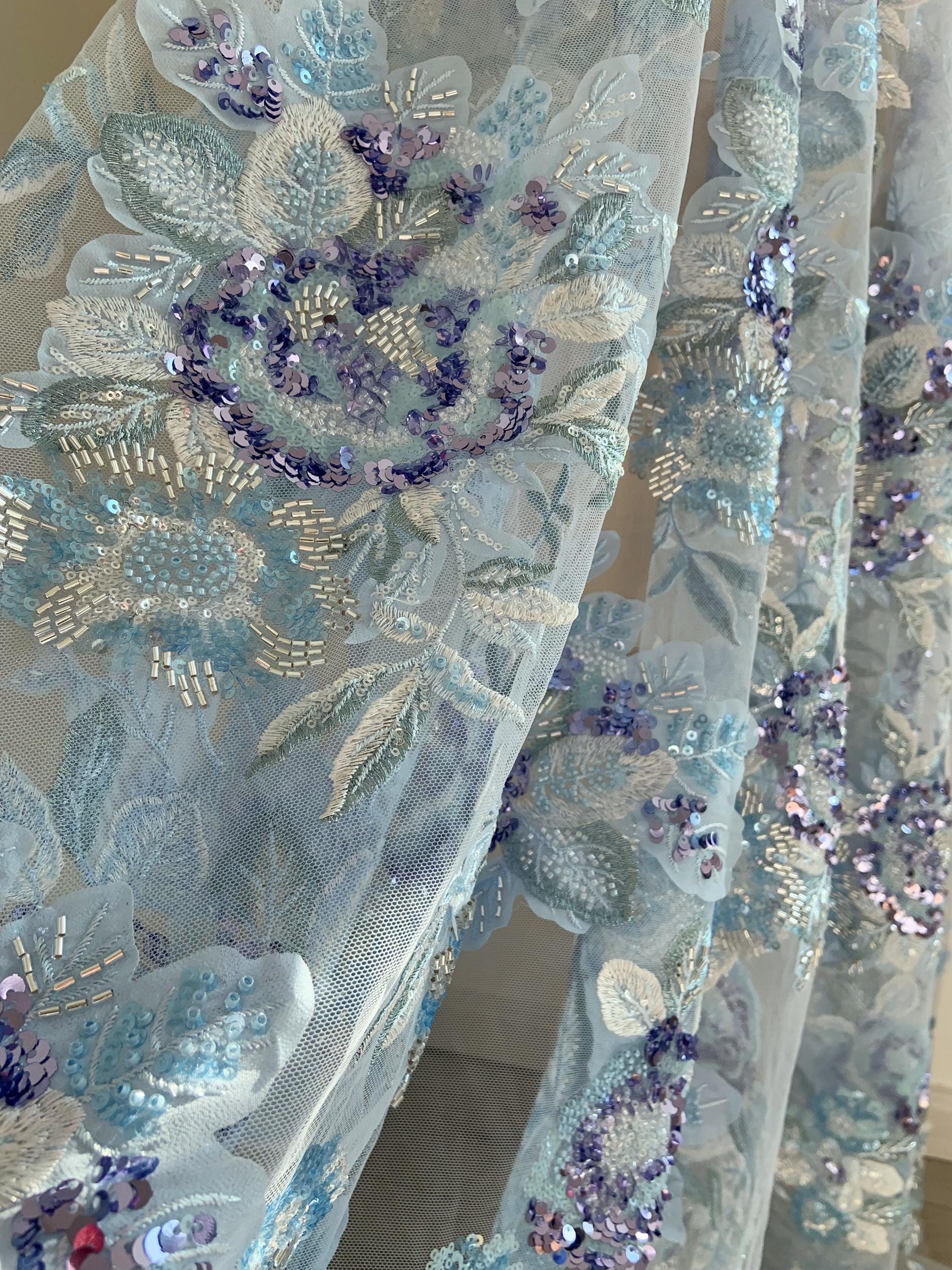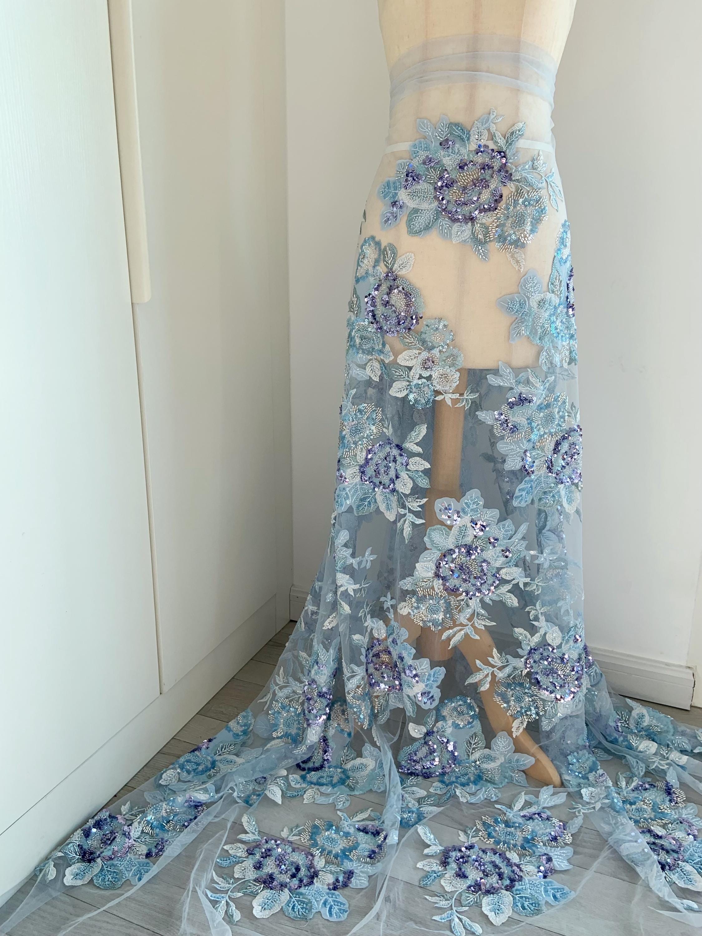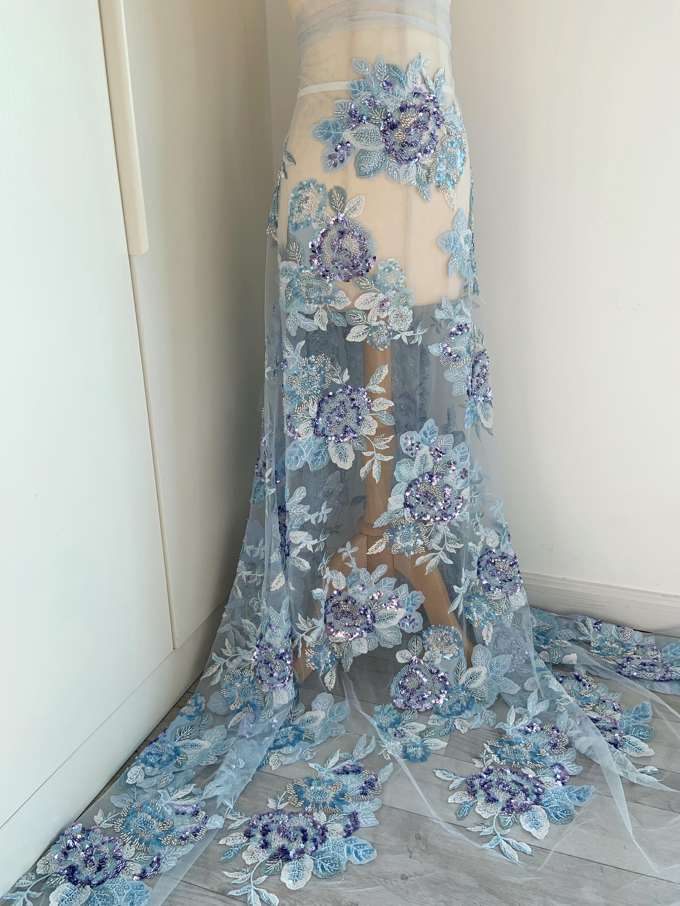 Baby blue bead embroidery fabric with flowers, heavy bead fabric with 3d florals for dress, couture