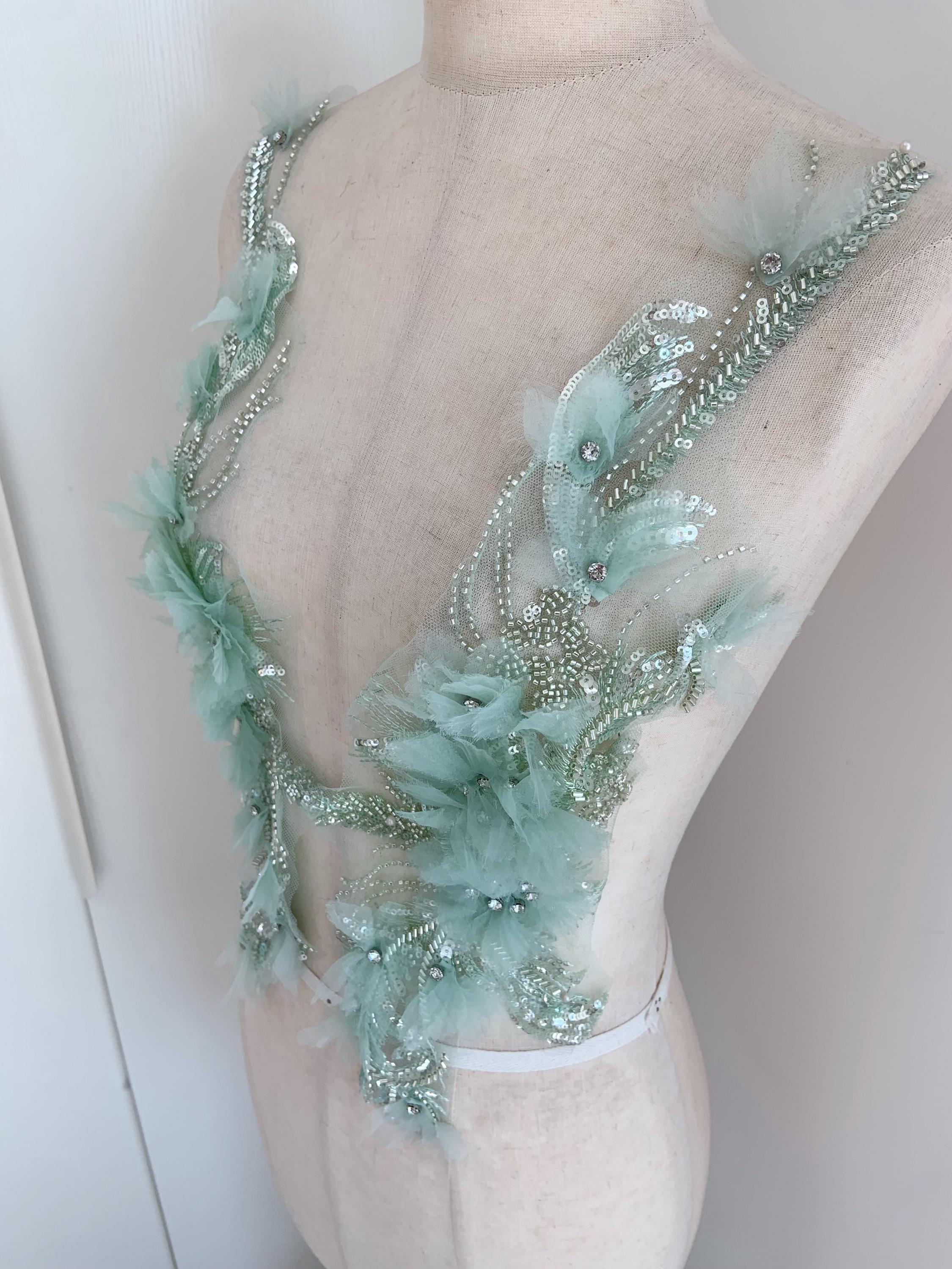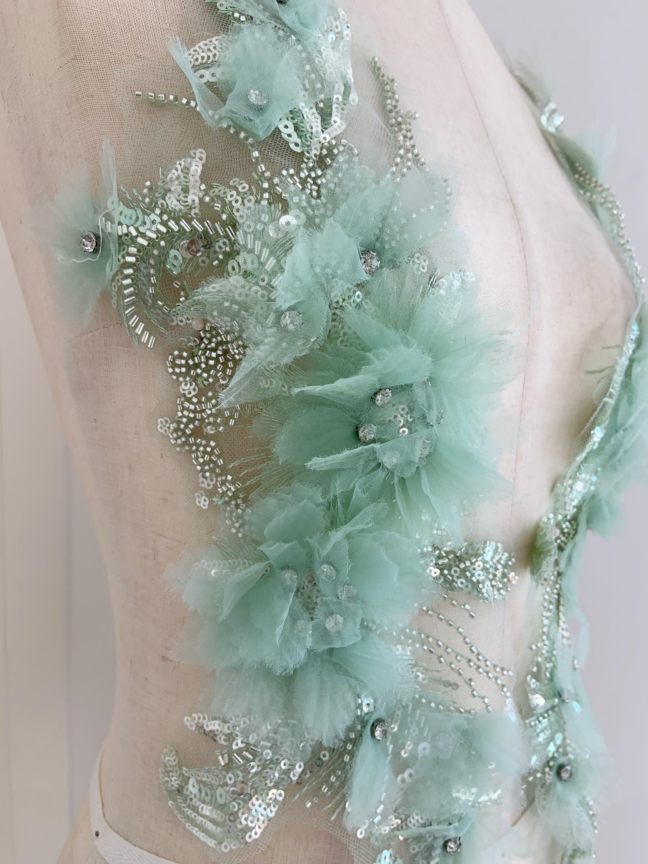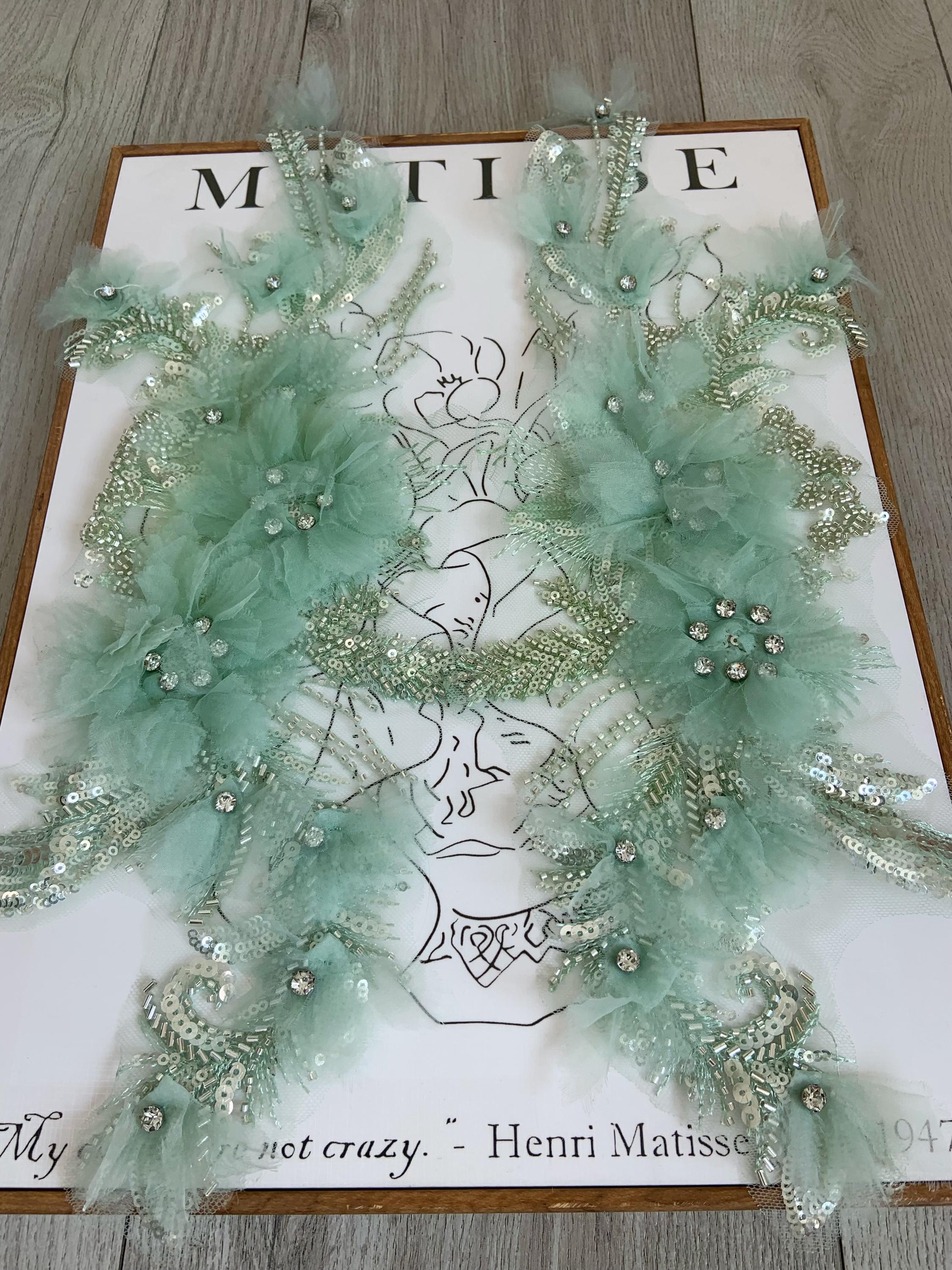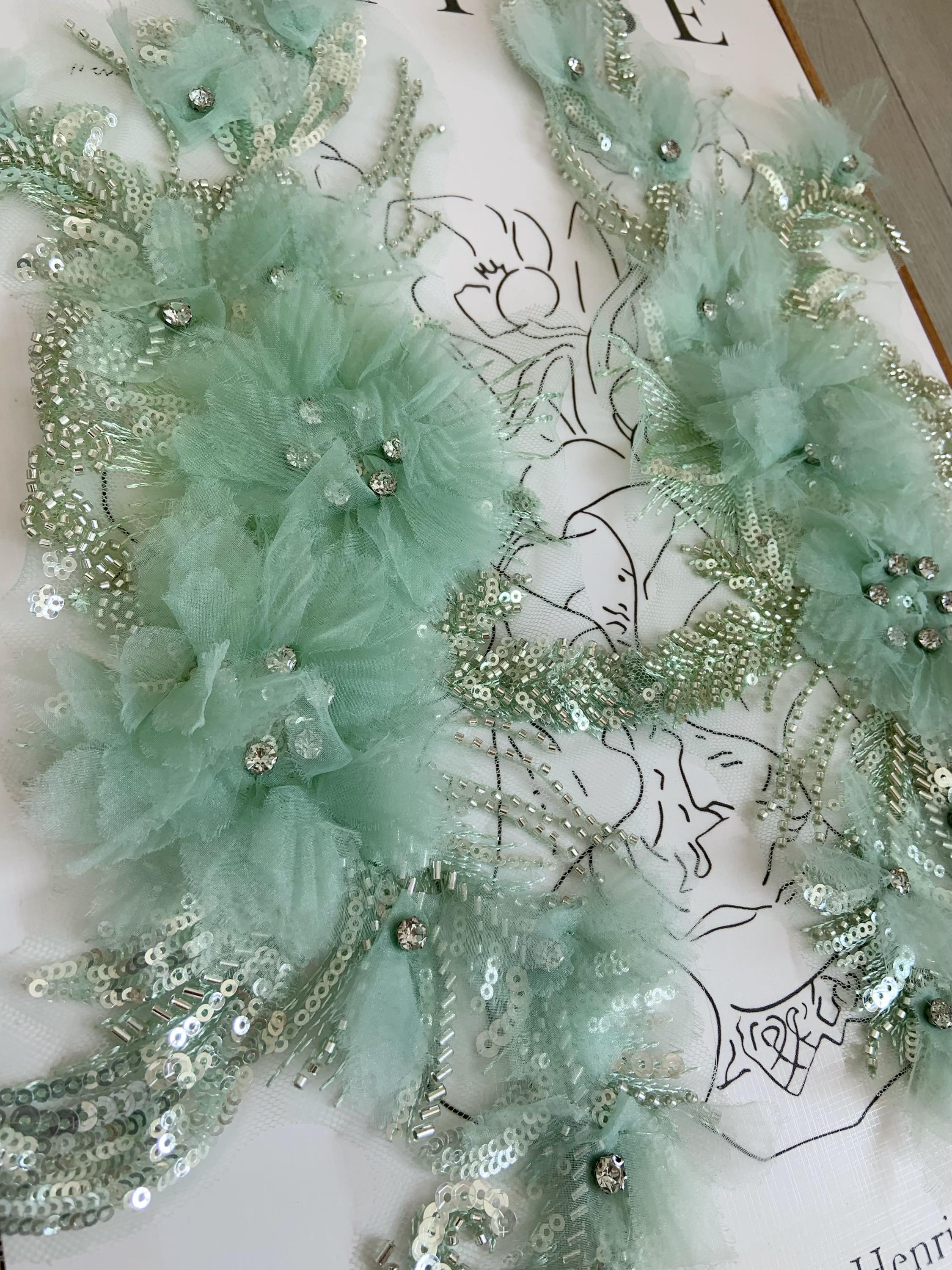 Light sage green appliqué with petals for dress Alterations Millinery dance costume, 3d floral applique