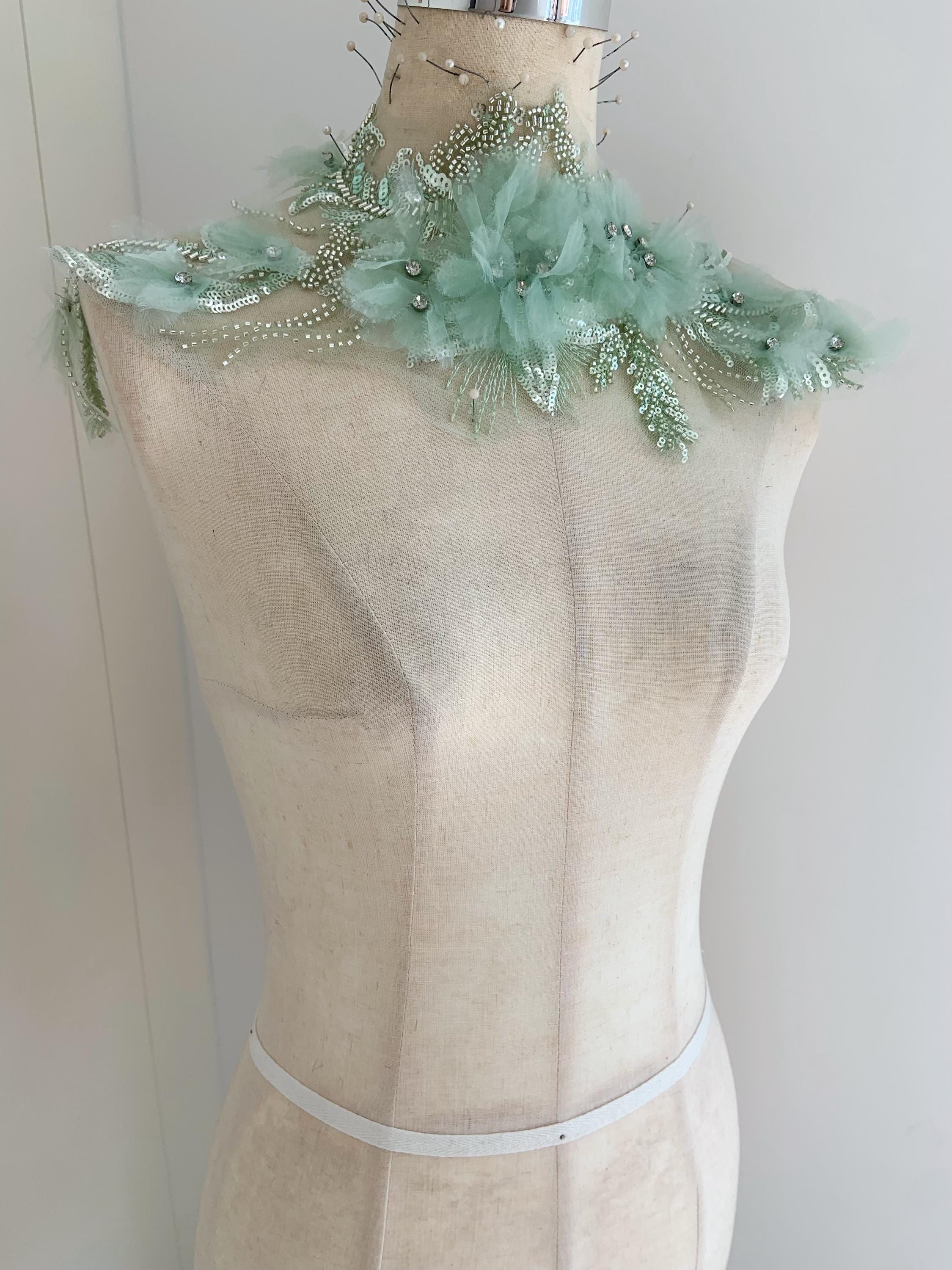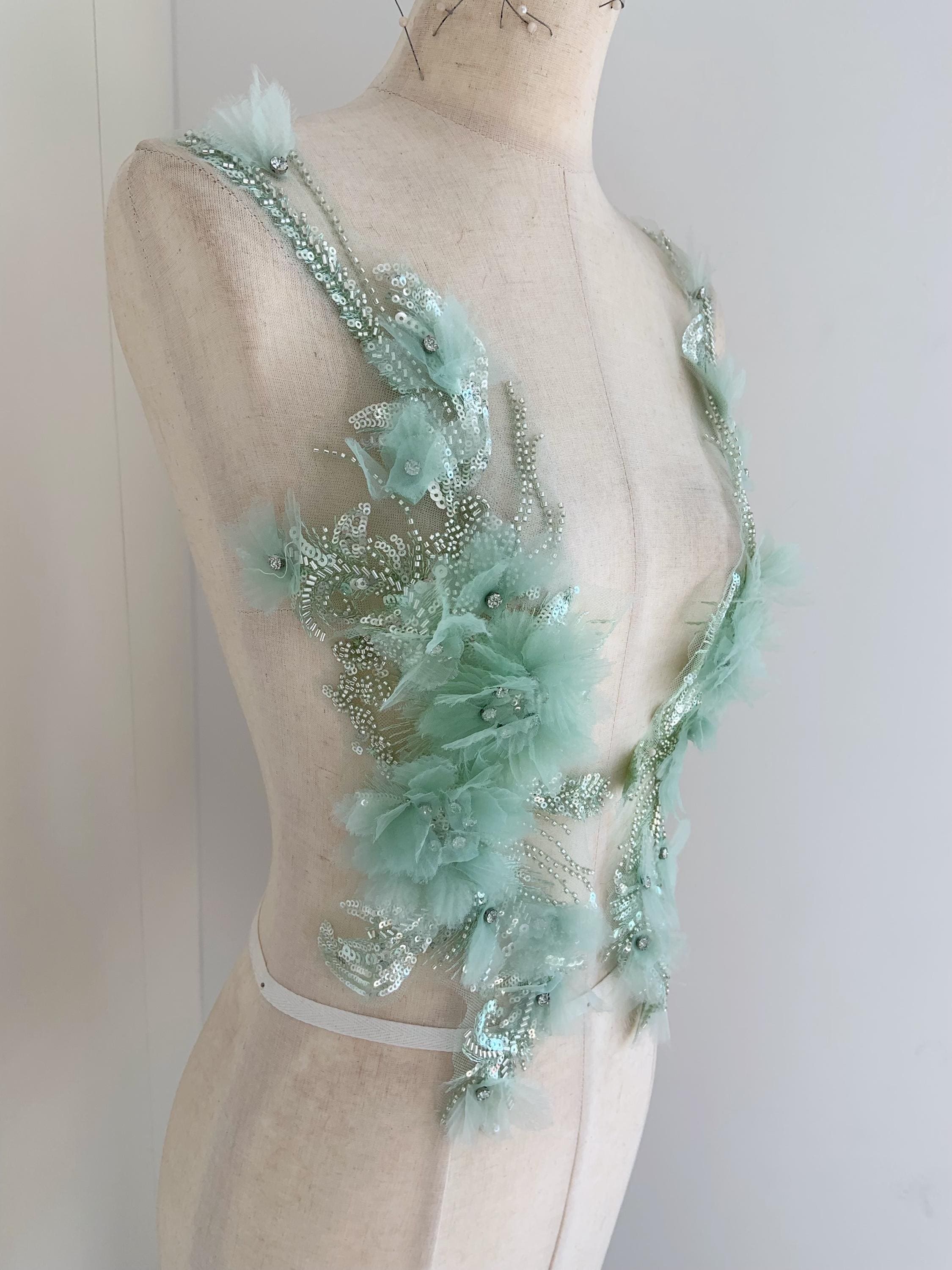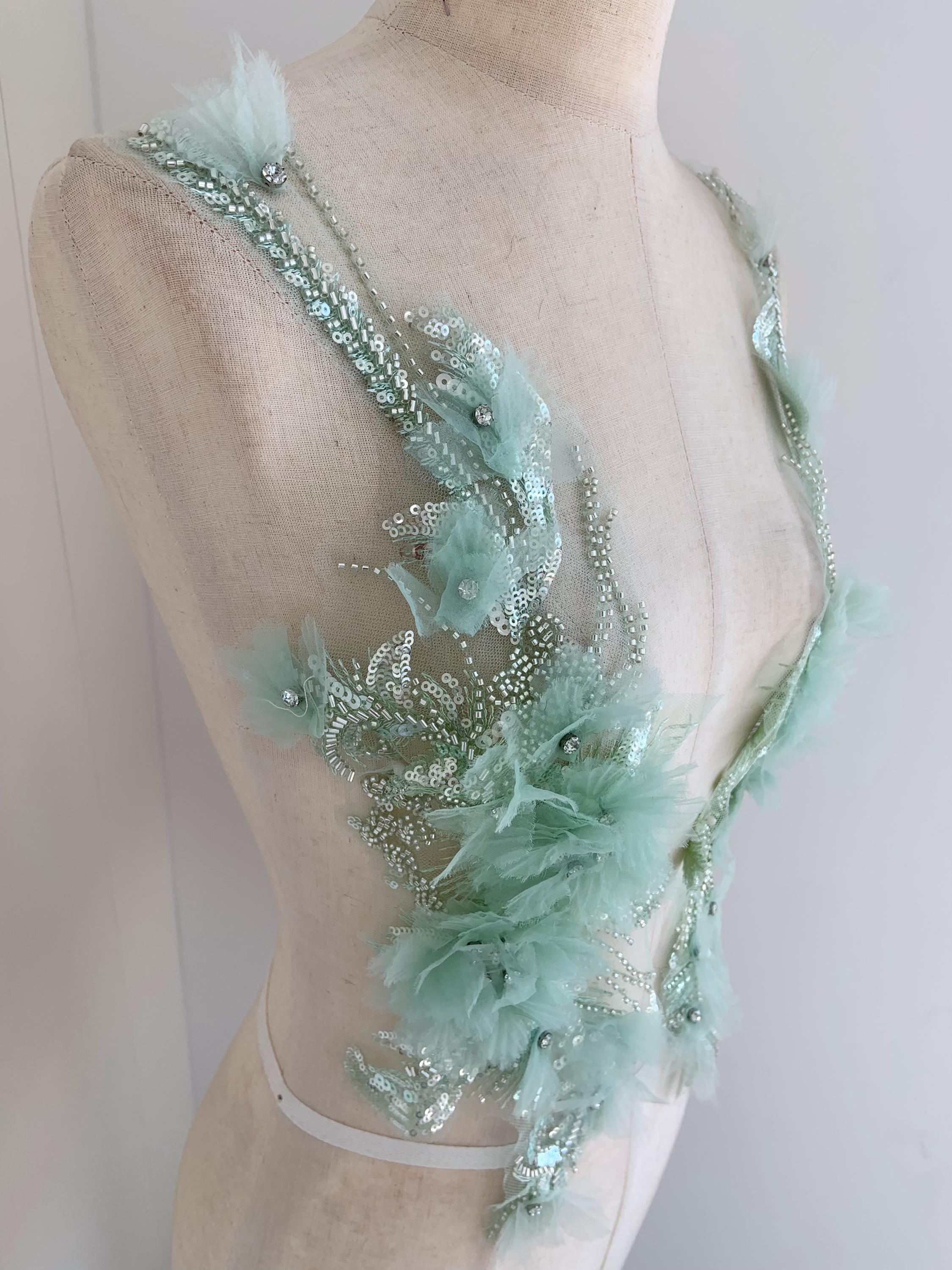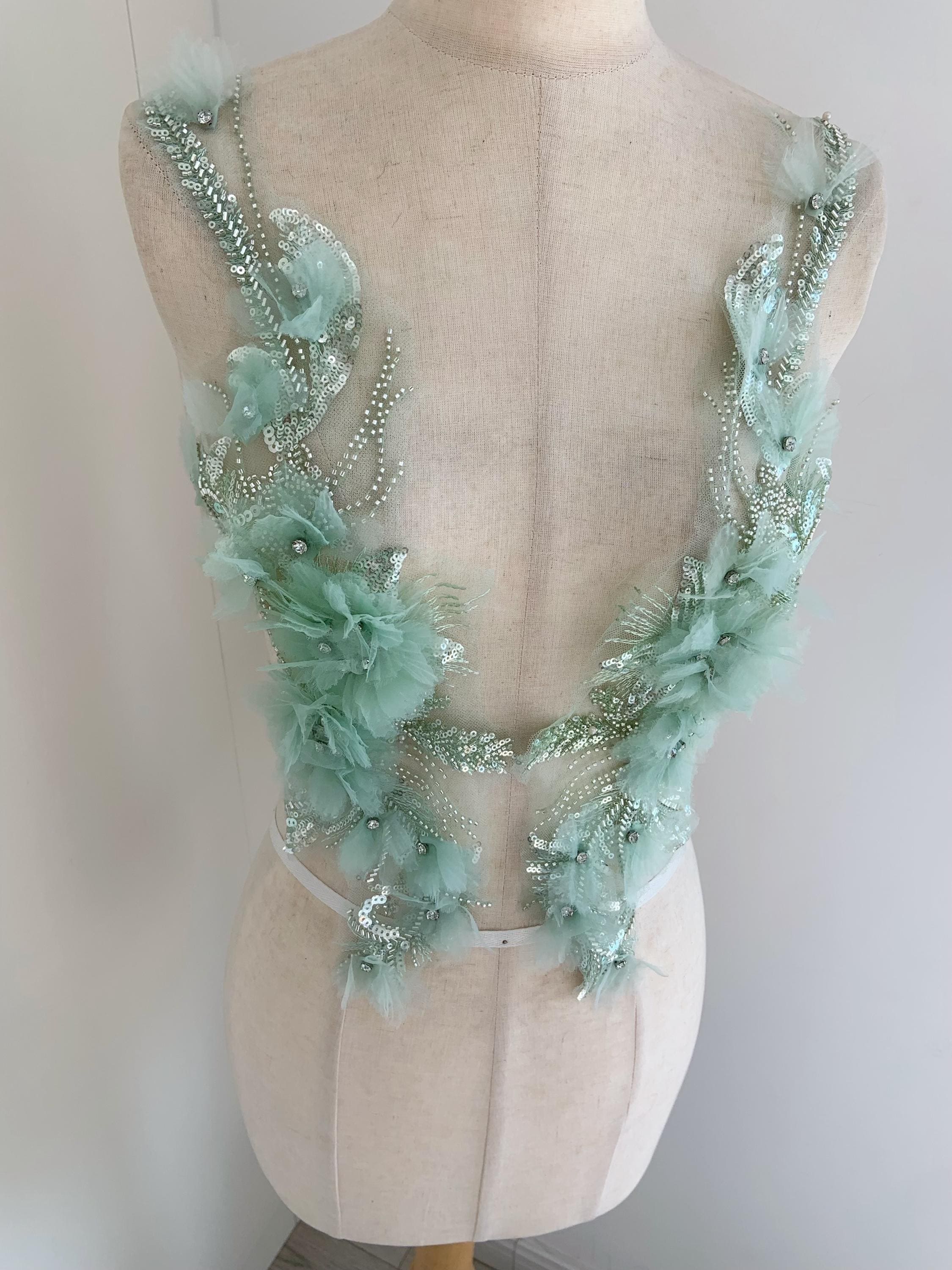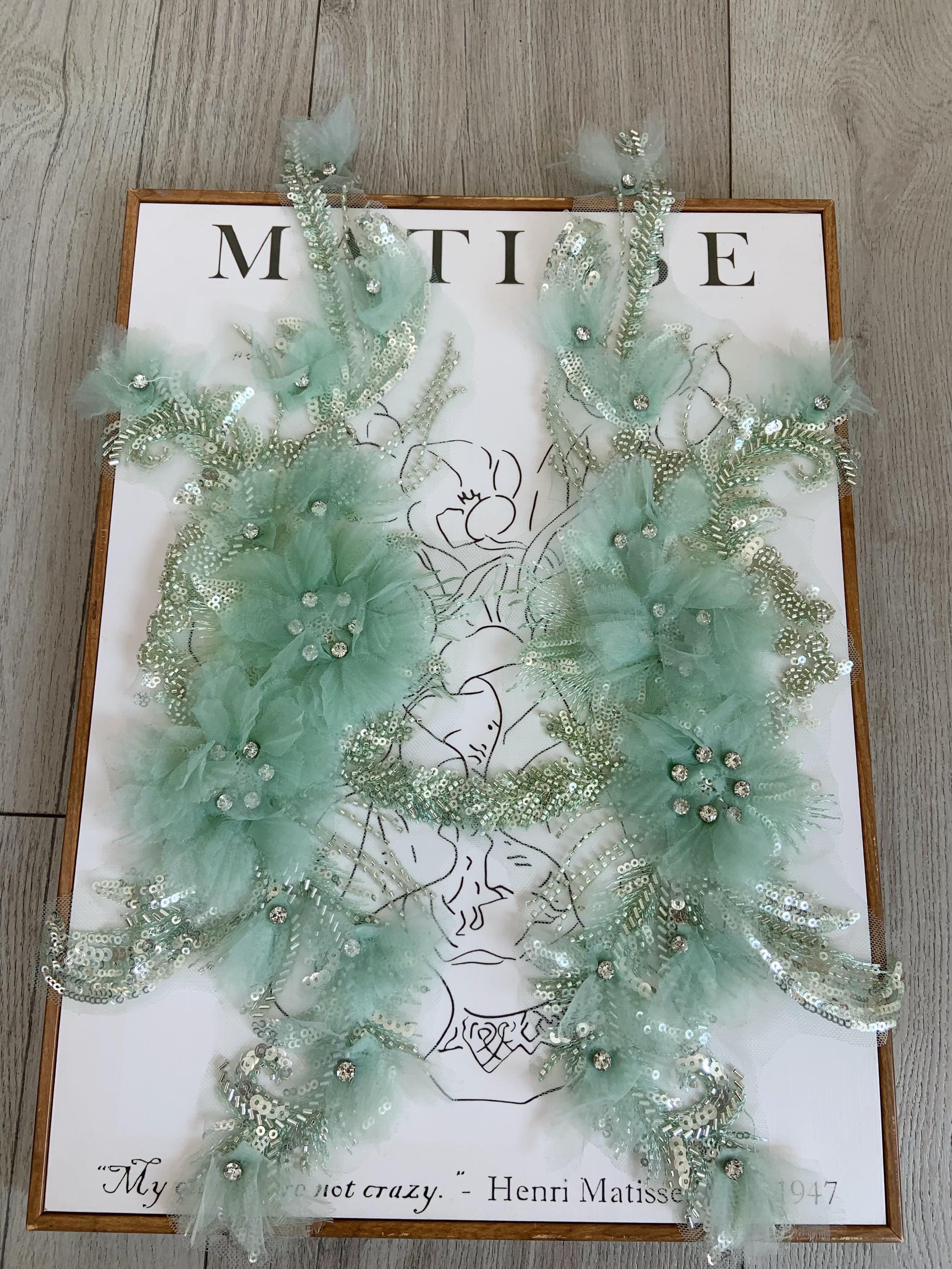 Light sage green appliqué with petals for dress Alterations Millinery dance costume, 3d floral applique