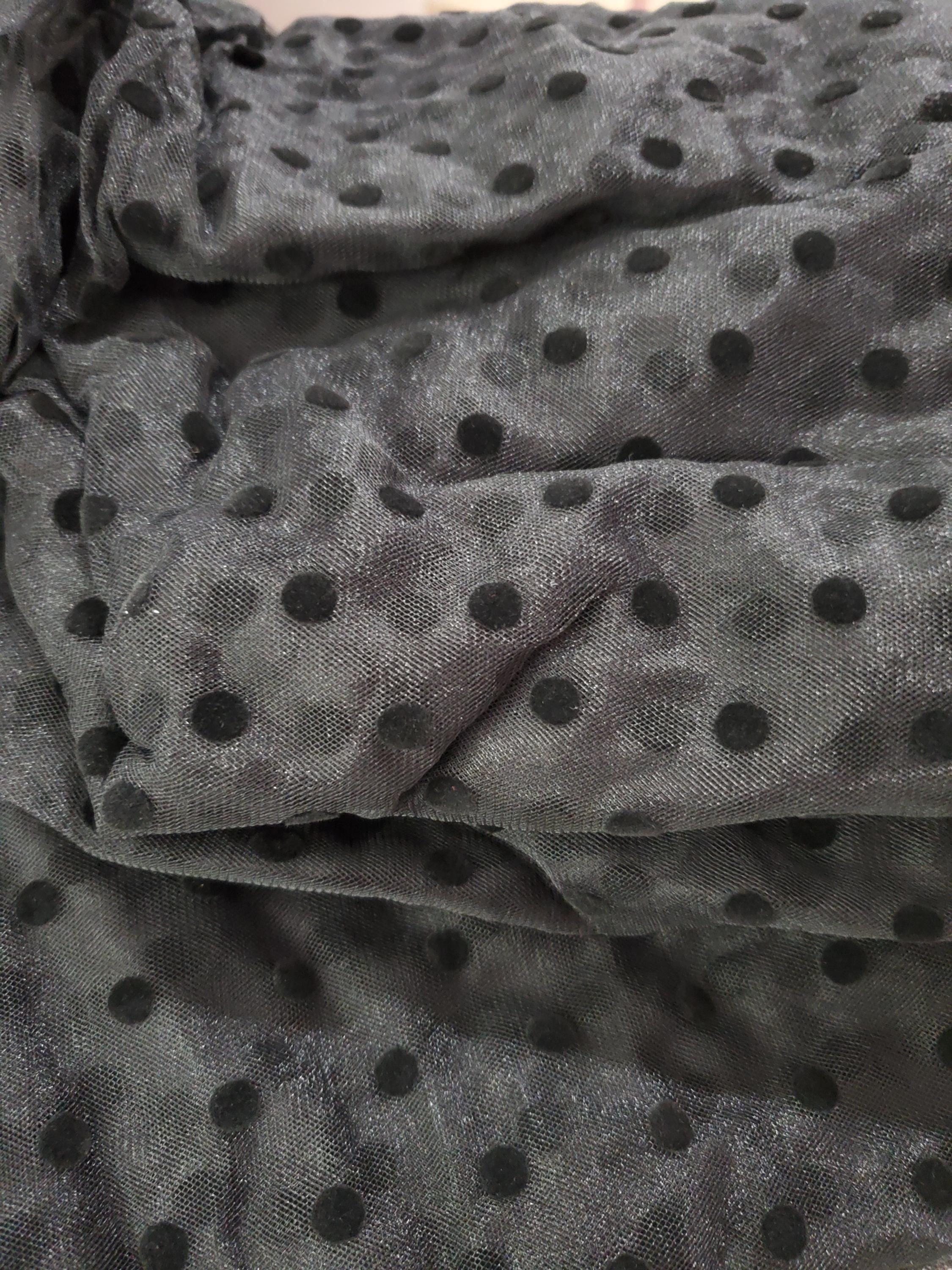 This tulle lace fabric is with velvet polka dots, suitable for dress and apparel, soft and flowy
